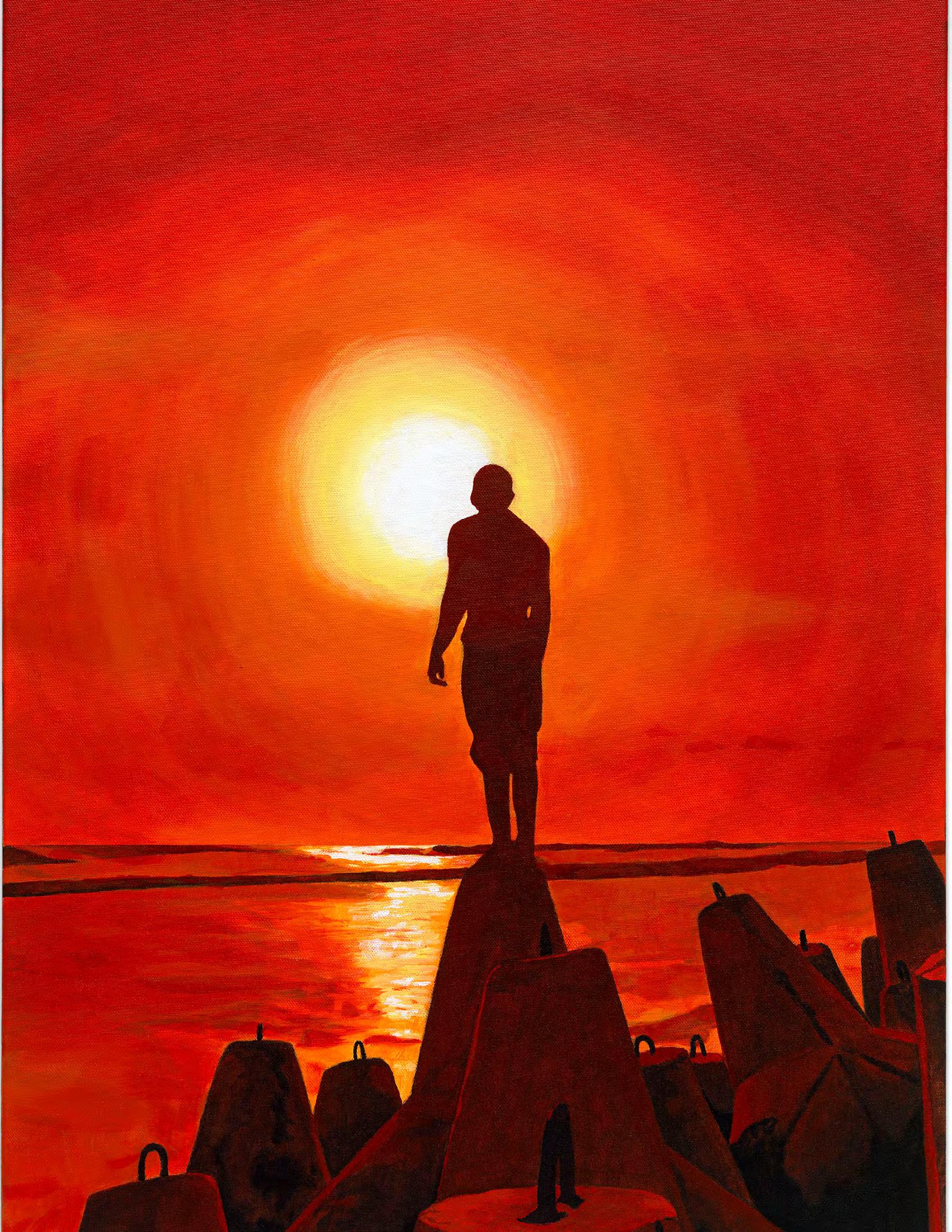 ‘And I Alone’ by Nean Kingdom captures a solitary figure standing on an ocean barrier, gazing into the vastness of a sunset. The warm glow of yellow, orange, and burnt orange immerses the viewer in a tranquil moment of solitude, inviting reflection on the power of isolation. Through cinematic and natural influences, Nean explores how solitude can bring clarity, strength, and a deeper connection to nature. The piece evokes the serene beauty of stillness, offering a space for introspection and self-discovery. This work reminds us that isolation, far from being an emptiness, can be a pathway to inner peace and connection with both nature and ourselves.