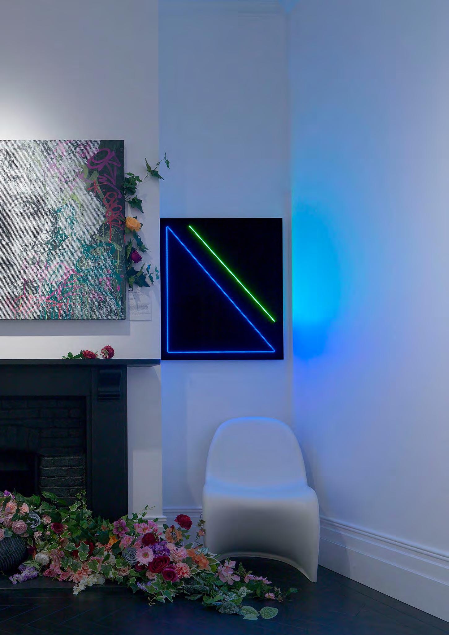 £2,750 Triangle Line distills Spidertag’s symbolic language into a minimal, architectural neon composition. A blue triangle, constructed from precise right angles, grounds the line in calm, geometric stability. Harmonious analogous transitions a singular green line floats in exact parallel, an intentional balanced echo rather than a disruption. This spatial relationship creates subtle tension through restraint, highlighting how meaning can emerge from precision and placement. The triangle symbolises foundation, the line signals gesture. This piece speaks to Spidertag’s broader visual vocabulary rooted in his concept of Futurism Privitisim, where light and structure merge. Triangle Line invites a meditative encounter with space, symmetry, and the silent strength of minimalism.