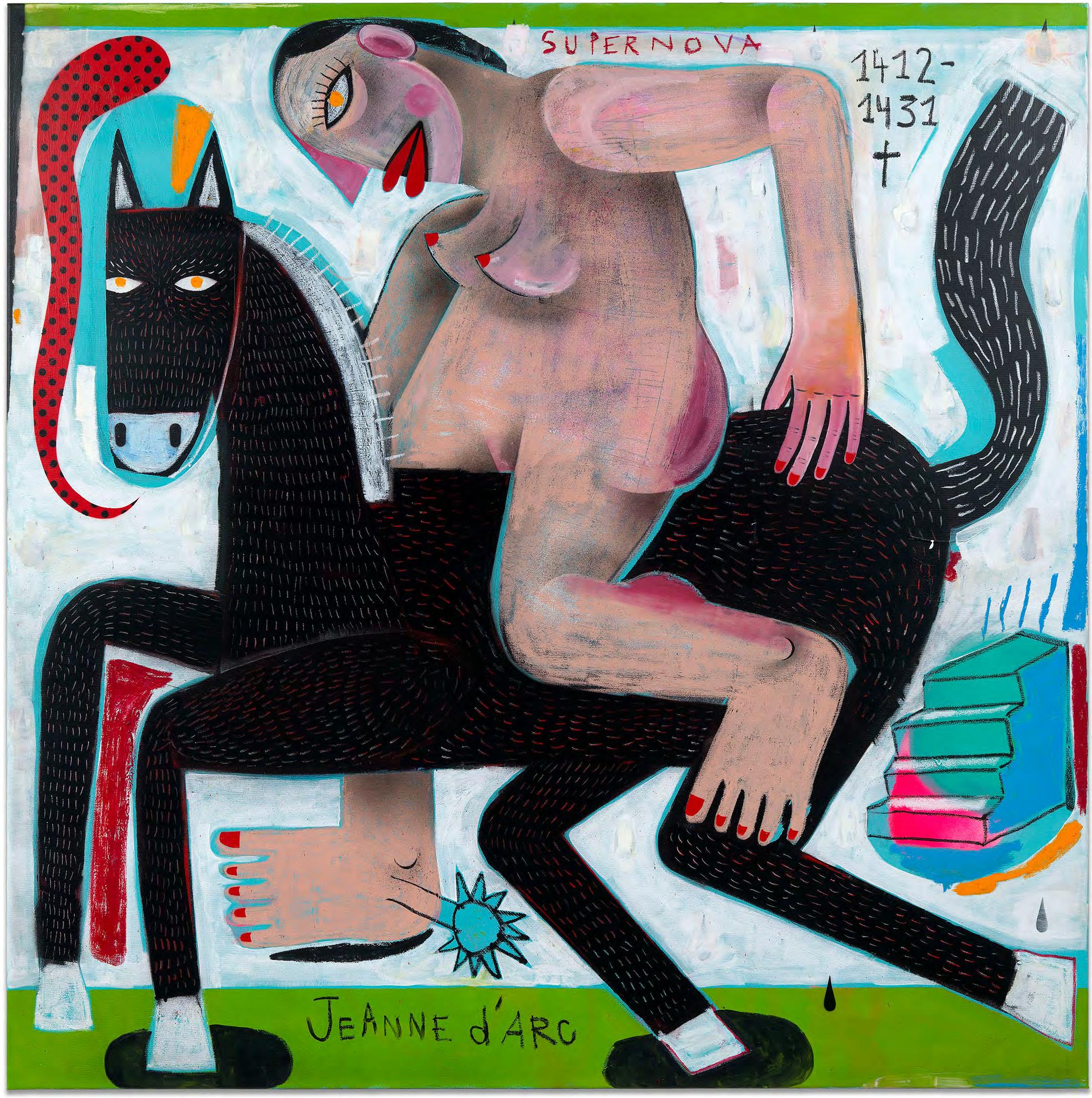 ‘Jeanne d’Arc’ is a powerful tribute to the enduring legacy of an extraordinary individual. Inspired by Joan of Arc, the national heroine of France, this work captures the pivotal moment when Joan’s story transcended time and history. At just 17, Joan, guided by divine visions, led French forces to key victories in the Hundred Years’ War, including the lifting of the siege of Orléans. Her bravery led to the coronation of Charles VII, altering the course of the war. However, at 19, Joan was captured, tried, and executed for Heresy and Witchcraft.. In this painting, Joachim portrays Joan in her most vulnerable state symbolising her sacrifice and loss of dignity. Yet, this vulnerability also represents her posthumous rehabilitation and sainthood, a powerful rebirth after she was exonerated. Riding a horse with wild hair flowing, she becomes a symbol of liberation and resilience.
