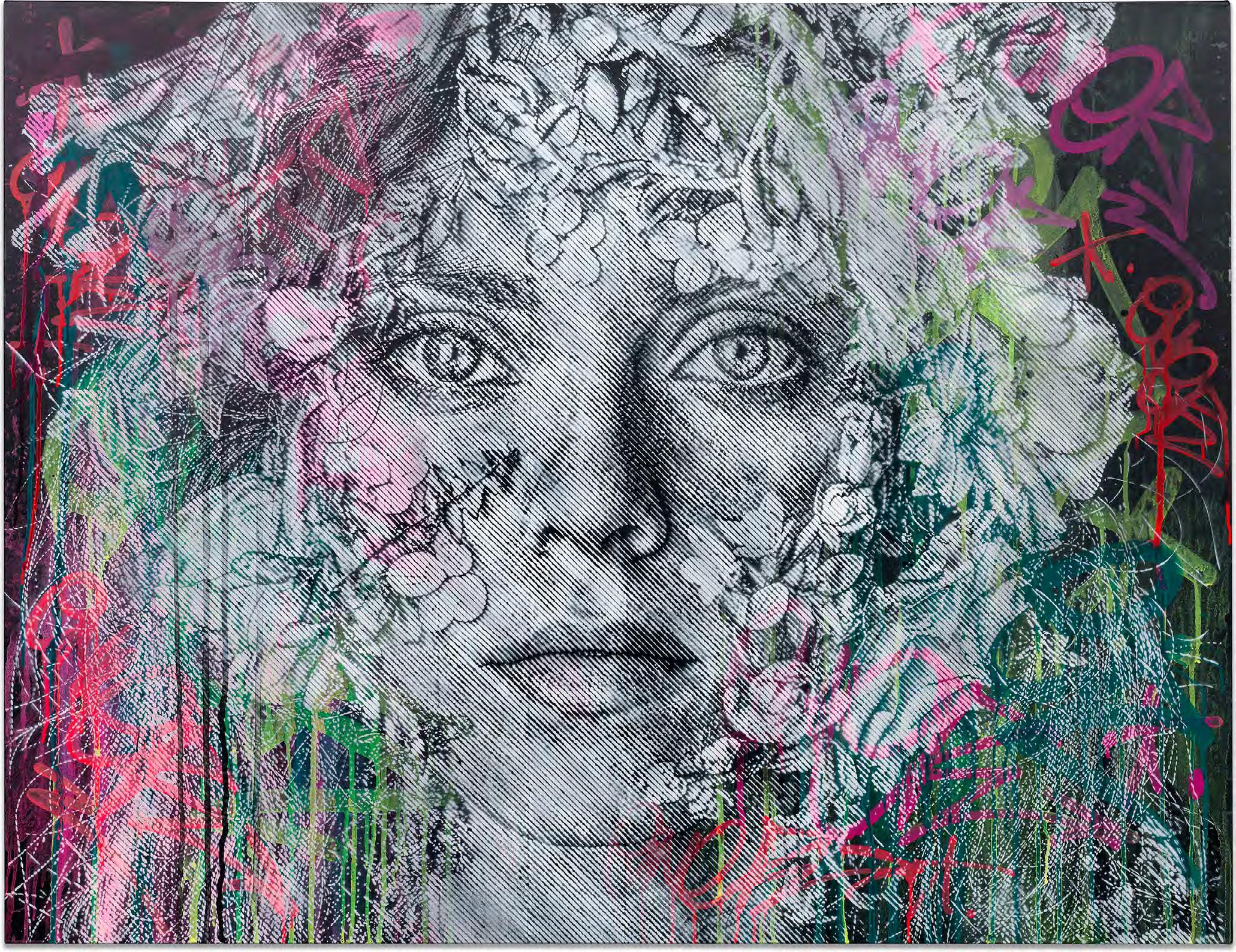 First painted as a mural in the heart of Paris, ‘Embers’ was born on a wall touched by fire, a place marked by the past, yet ready for new life. It was there Snik placed their portrait: a quiet figure, eyes in soft gaze, suspended between stillness and change. Delicate ivy, cut in black and white stencil, traces across her face, resilient, reaching, while warmth blooms outward in soft layers of spray-painted colour, evoking the glow of something enduring. Through their signature technique, Snik creates a moment where beauty lingers at the edge of transformation. Embers is not about what was lost, but what holds on. A pulse beneath the sur face. The quiet beginning of what grows back stronger.