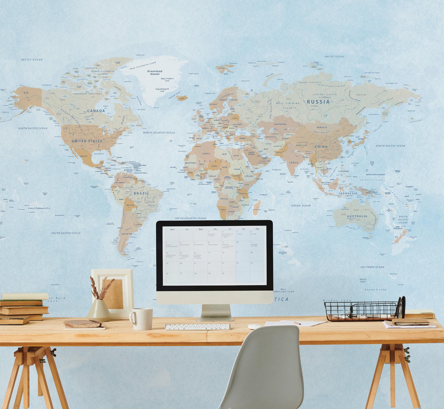 DETAILED WORLD MAP - COLOUR - VERSION 1 VERSION 1 IS SUITABLE FOR WIDE LANDSCAPE WALLS DETAILS INCLUDED - COUNTRIES, STATES, CAPITAL CITIES & OCEANS