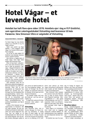 Hotel Vágar – et levende hotel Hotellet har haft flere ejere siden 1978. Hotellets ejer i dag er P/F Gist&Vist, som også driver cateringselskabet Vistveiting med leverencer til hele Færøerne. Sára Simonsen Vikre er salgsleder af Vistveiting Af journalist Beate L. Samuelsen Fra Hotel Vágar har man direkte udsigt til al flytrafik til og fra Vagar Lufthavn. Siden Lars Larsen og Hugo Fjørðoy i 1978 byggede Hotel Vágar, har hotellet skiftet ejere i flere omgange. For et par år siden købte P/F Gist&Vist med direktør Johannes Jensen i spidsen hotellet. Kári Hentze er daglig leder af Hotel Vágar. Hans højre hånd hedder Sára Simonsen Vikre. Efter at have boet i udlandet i 24 år, kom Sára Simonsen Vikre, som er født og opvokset i Sør vágur, tilbage til Færøerne i slut ningen af 2014. Hun var heldig straks at få jobbet som leder af lufthavnens cafeteria, som drives af Gist&Vist. I februar 2015 overtog hun jobbet som leder af Hotel Vágar i fem måneder, hvorefter hun overtog sit gamle job igen i lufthavnens cafeteria. Sára Simonsen Vikre har en gymnasial uddannelsesbaggrund, først på Færøerne og siden HA i Danmark. Efter fem år som stewardesse på Færøruten hos Maersk Air, bosatte hun sig i Portugal, hvor hun arbejdede med passagerhandling i byerne Faro, som ligger i Algarve, og Lissabon. Det var en virksomhed, som hendes mand og svigermor havde. Deres samarbejdspartnere var nordiske flyselskaber, som fløj til Portugal. I marts 2014 flyttede hun og ægtemanden til Færøerne. Det var nogle måneder, før den nye lufthavn på Færøerne skulle åbne midt i juni, og hun søgte job i Tax Free. Hun var heldig at få fuldtidsarbejde der. Men kort før hun skulle begynde i det nye job, blev hendes udlængsel sydpå så