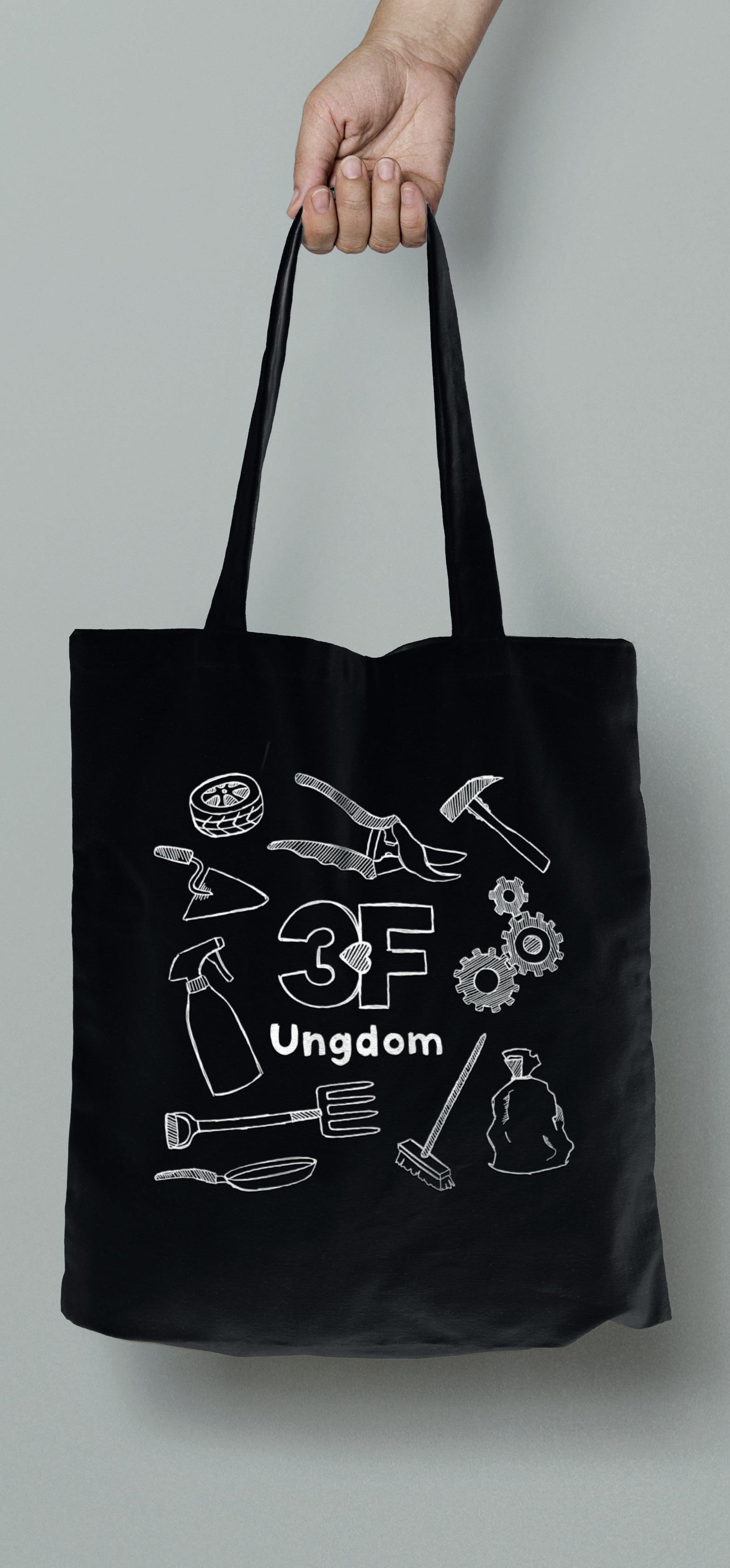 Illustrationer, der repræsenterer fagene i 3F Ungdom. Blandt andet anvendt på mulepose.