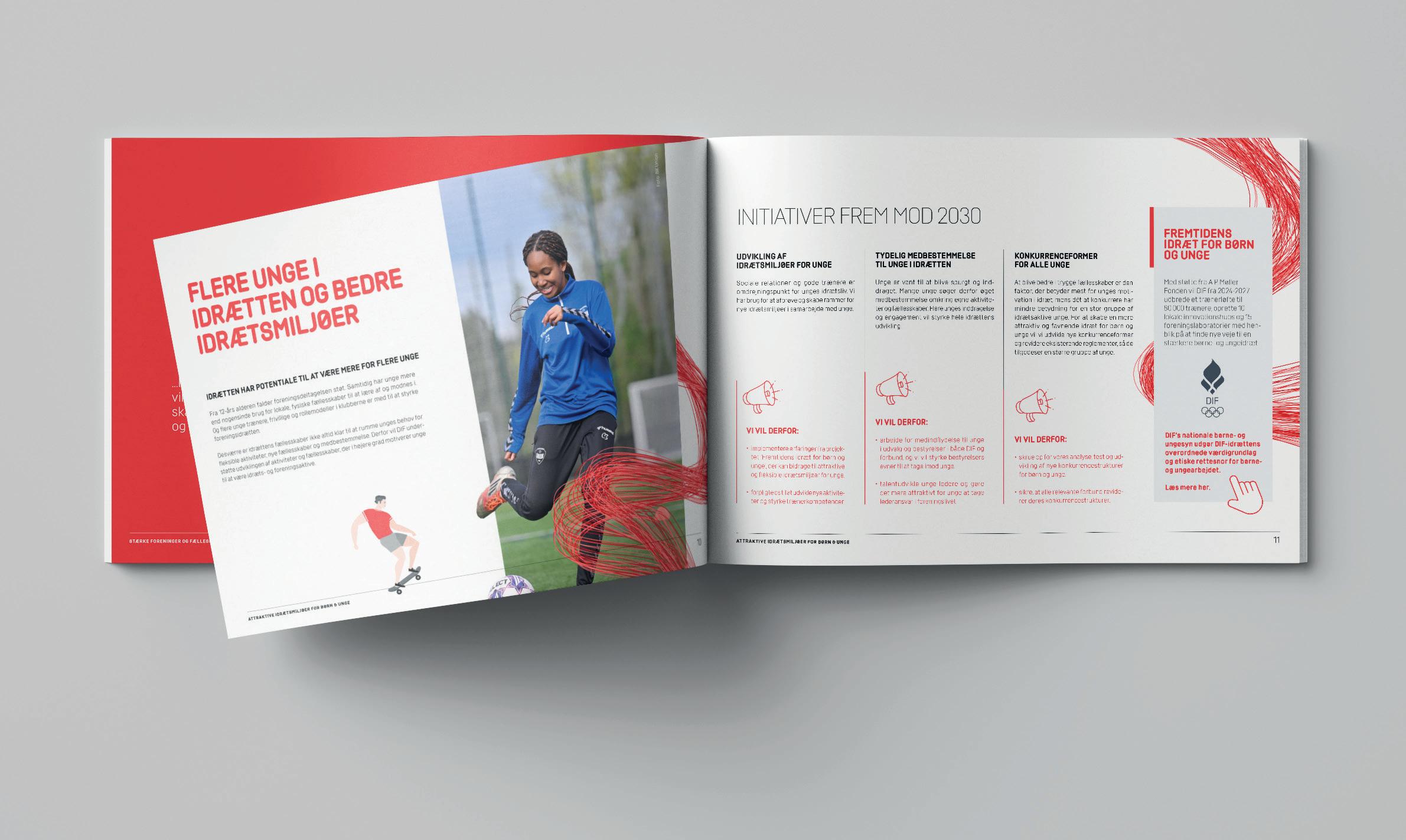 Publikation for Danmarks Idrætsforbund med fokus på en spændende læseoplevelse. Veludført infografik og dynamiske billeder medvirker hertil.