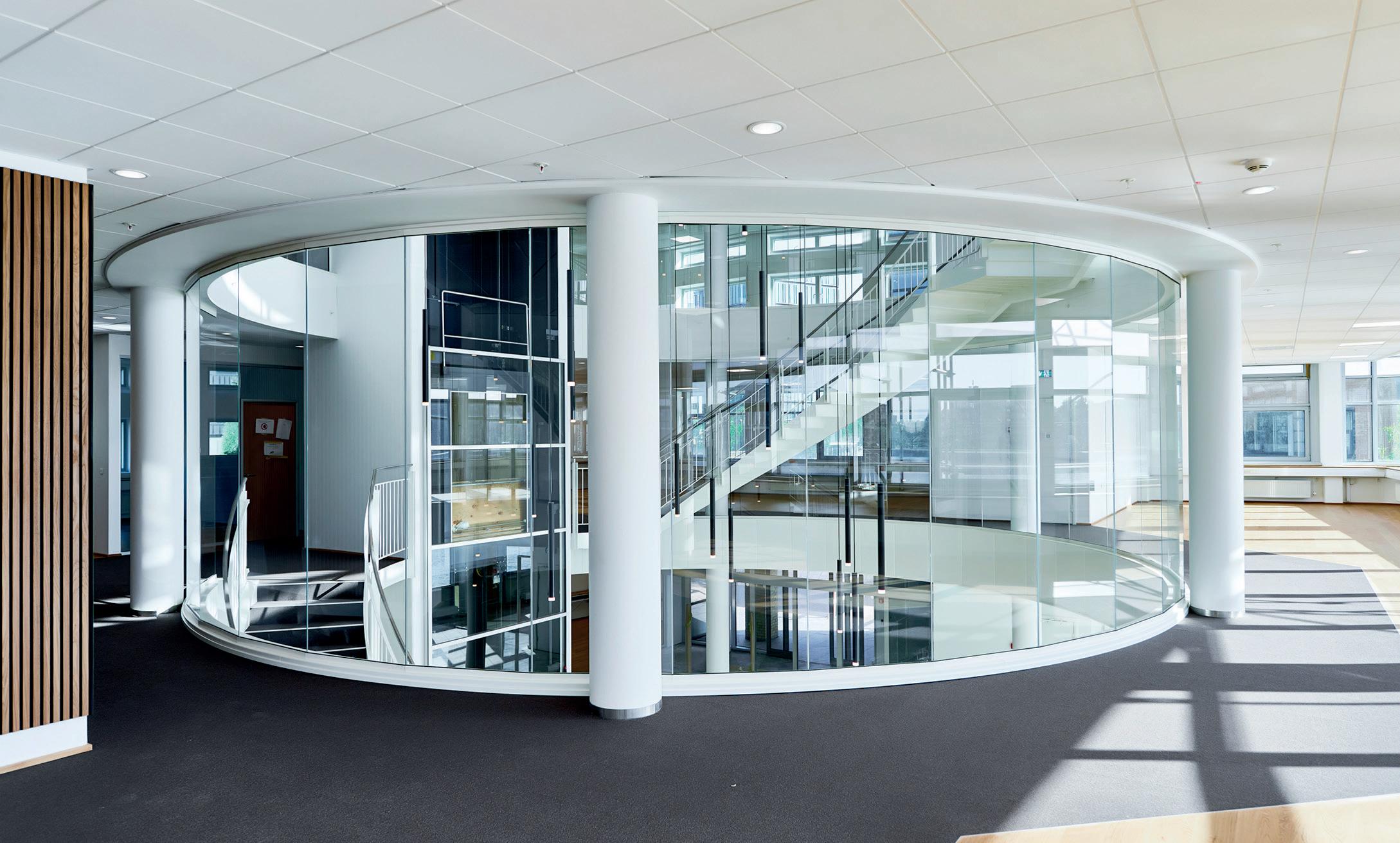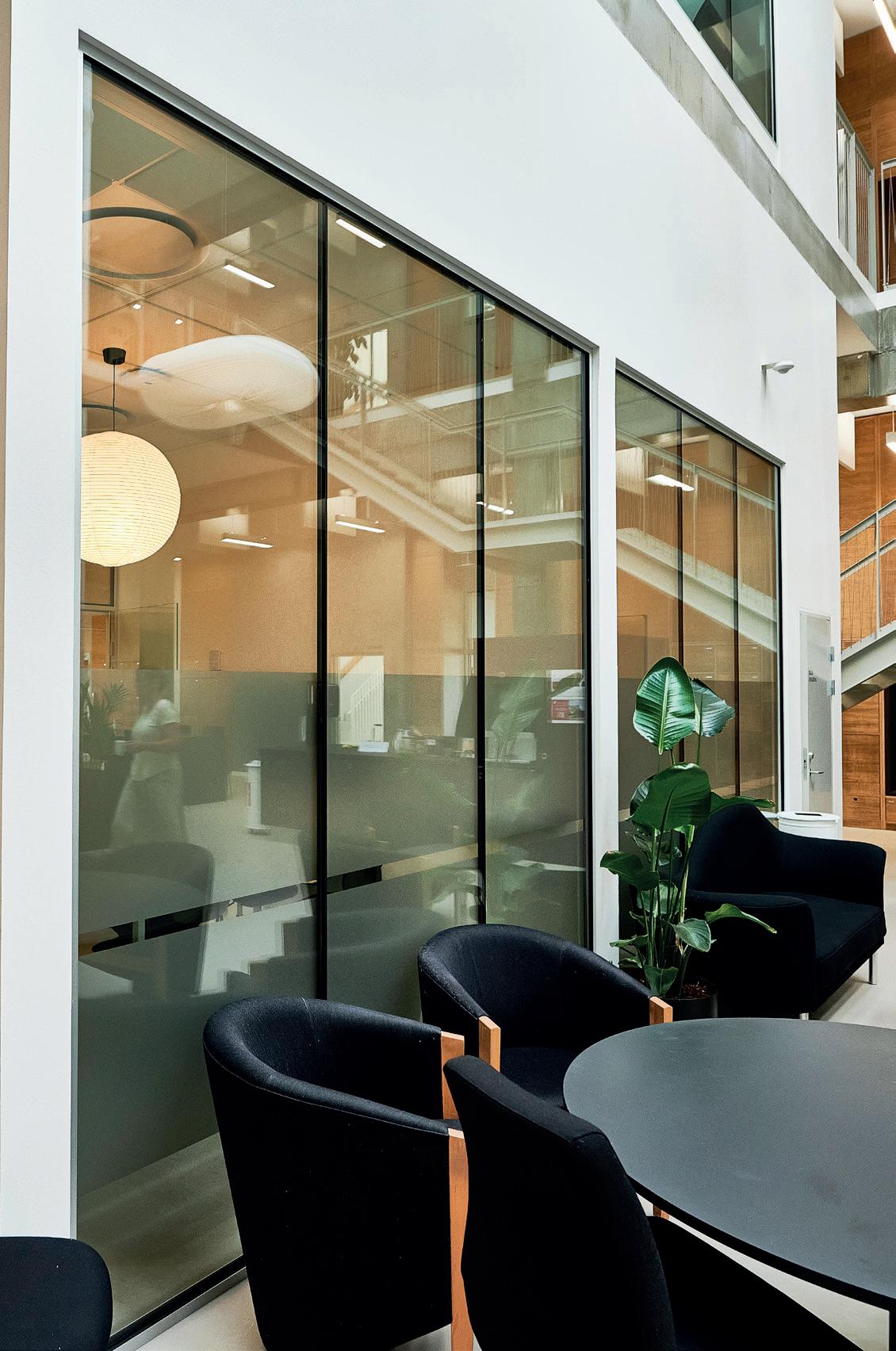 The building features a large atrium on the ground floor, bringing daylight to all levels through an impressive glass roof. On the ground floor, where the canteen and library are located, we installed 7.5-meter-high glass walls as partitions to the entrance foyer – the tallest glass walls Lafuco has delivered to date.