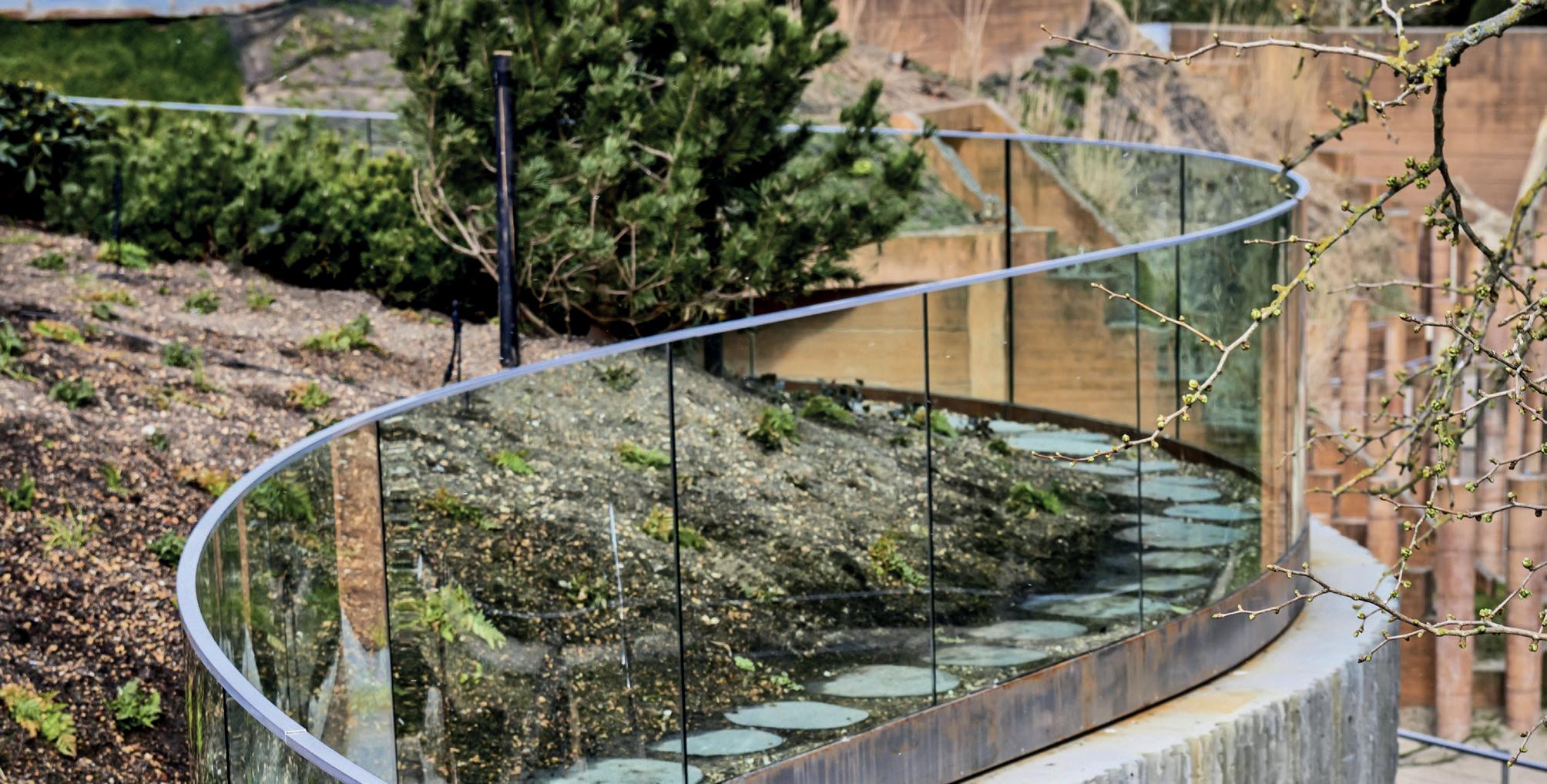For this spectacular BIG-designed project, we delivered curved and angled glass panels that follow the building’s sweeping concrete edges and the varying terrain. The railings are made of 21 mm tempered and laminated glass, clamped and secured with steel plates precisely shaped to match the glass contours, creating a clean and elegant finish.