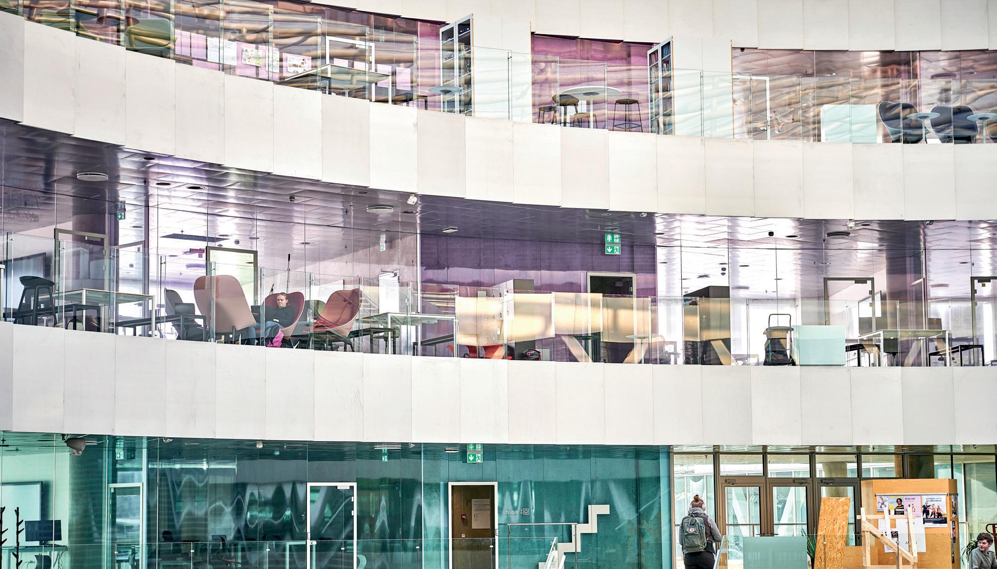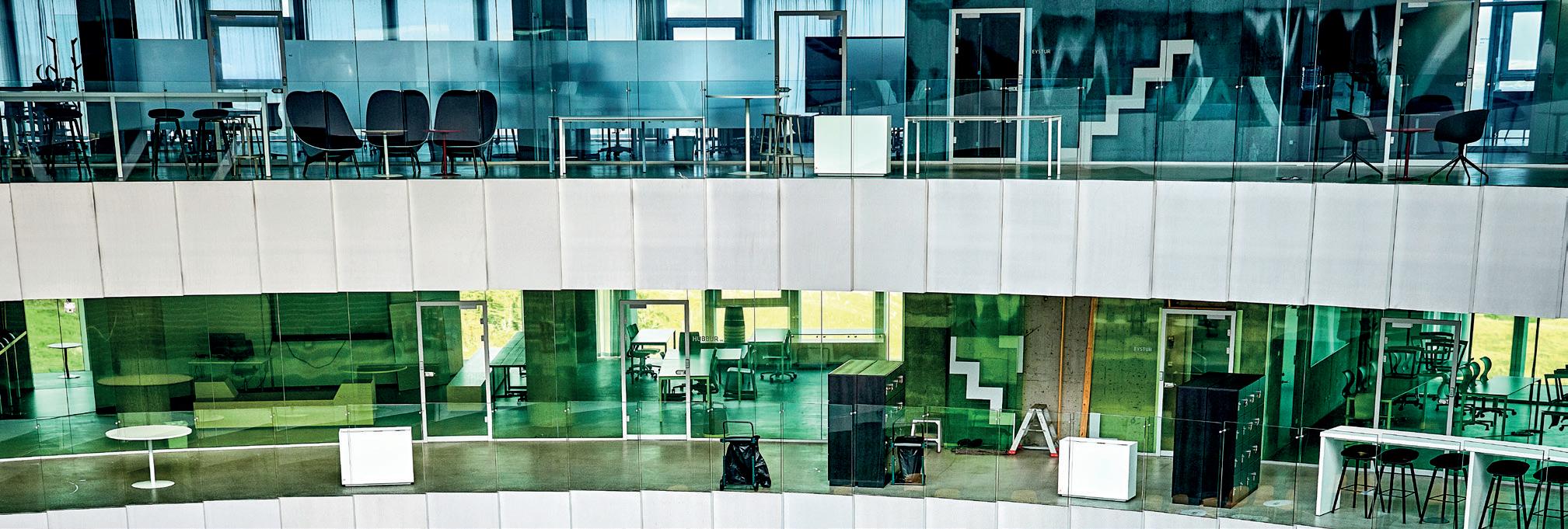 Henning Larsen Architects has designed a striking triangular building on the former warehouse area at Kolding Harbor, now home to the University of Southern Denmark. Lafuco supplied the glass walls – including an amoeba-shaped meeting room.