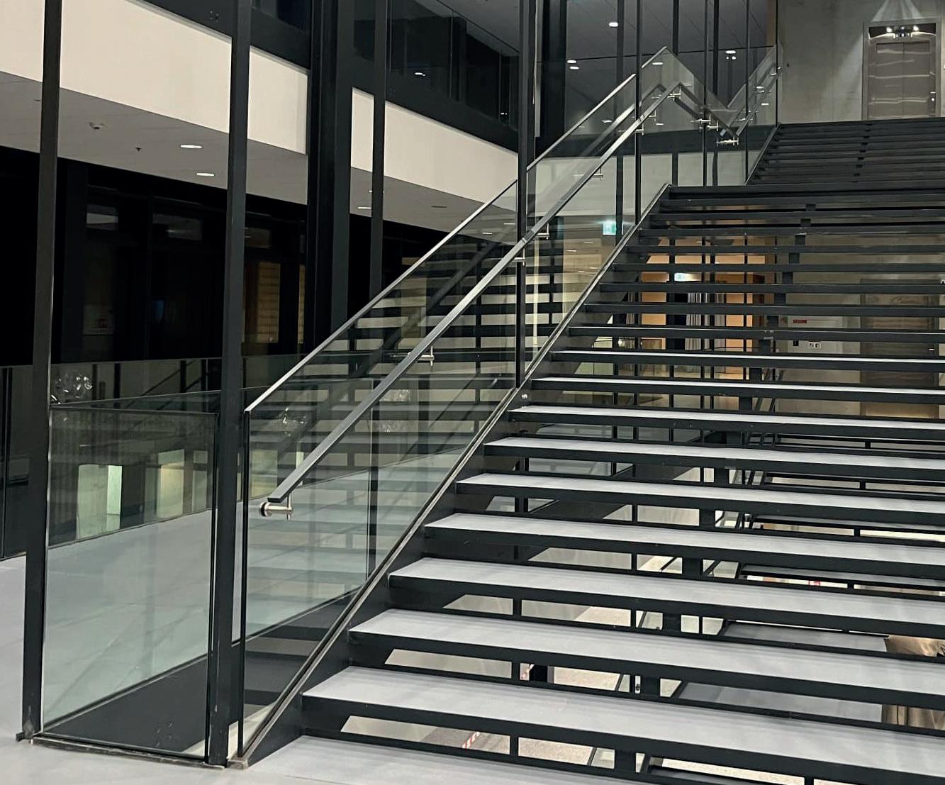 The new SUND building, connecting the New OUH with the University of Southern Denmark, features a modern design with 1,500 meters of glass railings on landings and staircases. The project included the development of a custom handrail to match the architect’s vision.