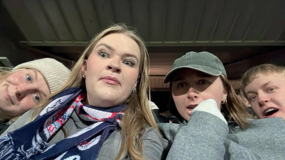 Her er jeg på stadion for at se AGF sammen med tre af de vigtigste personer i mit liv – nemlig mine to roomies, Liv og Alma, samt min kæreste Kristian. Hvis du synes, du kan genkende dem, har du nok ret. De er nemlig DSU’ere ligesom mig!