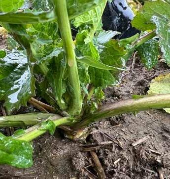 VIRUS RESISTENS Symptomer på rapsrødsot. Til venstre ses et blad med den karakteristiske violette rand, der kan iagttages fra midt på efteråret, og til højre symptomer fra slutningen af maj. Bladlæsioner i efteråret (venstre) forårsaget af L. maculens. Svampen vokser fra bladene ned gennem bladstilken til rodhalsen, hvor den forårsager rodhalsråd forår og sommer (højre).
