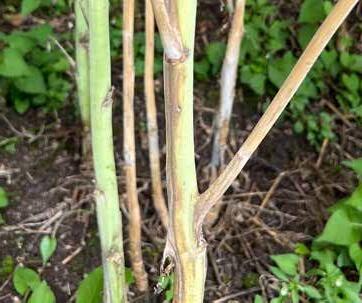 Hvid marv i rapsstængler ved høst uden gnav fra bladribbesnudebiller