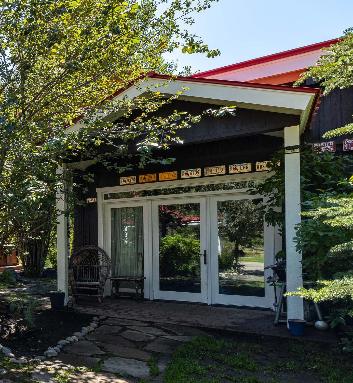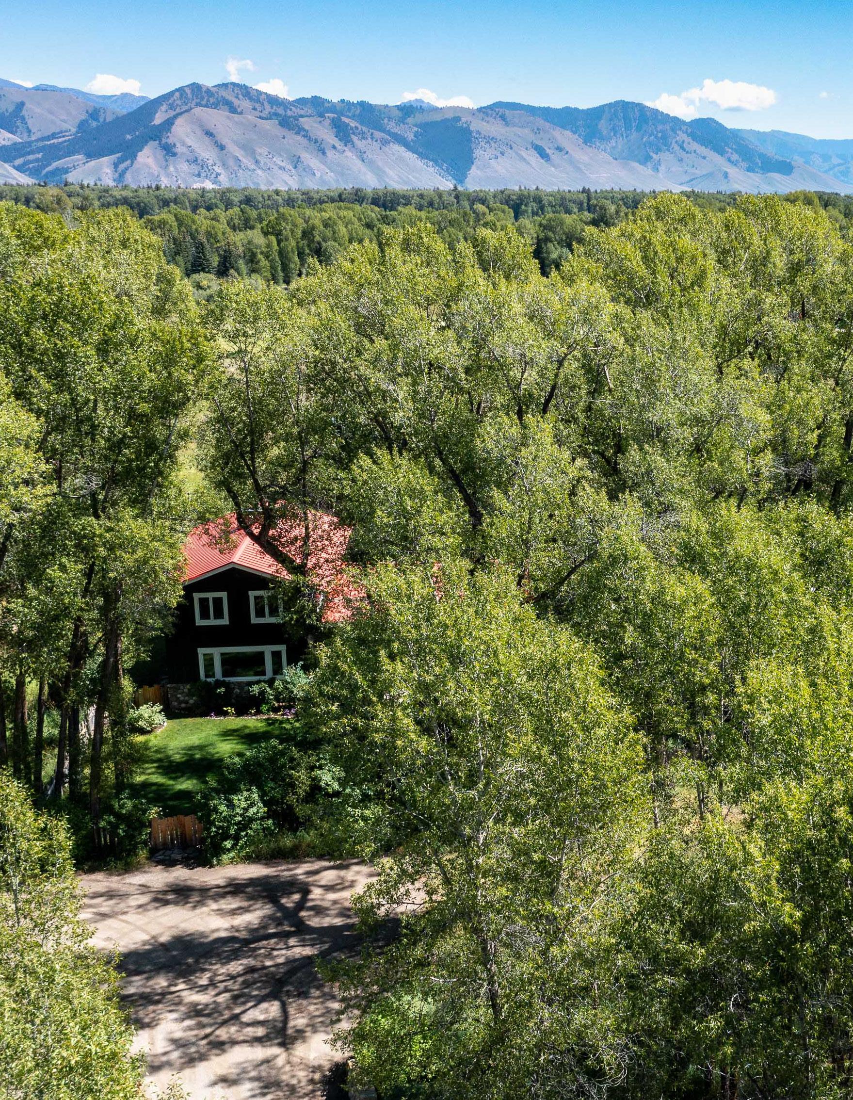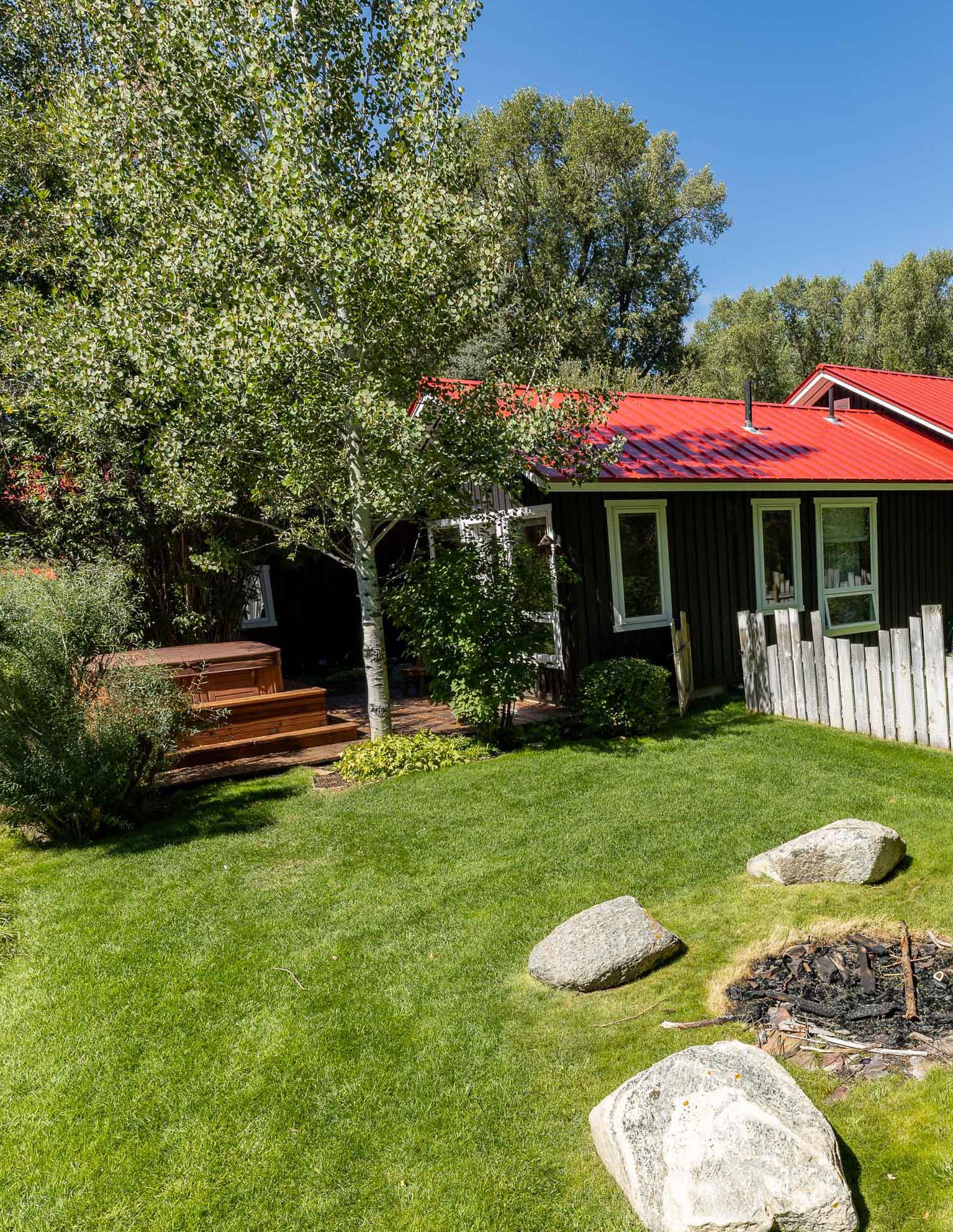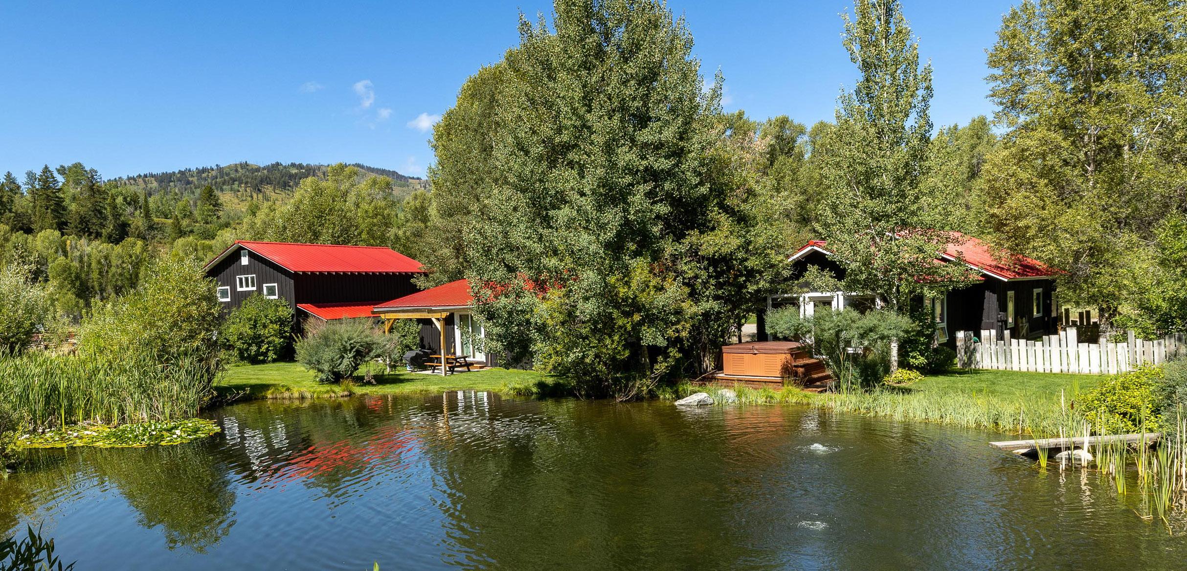 The main house, tucked on the private eastern edge of the property within earshot of the Snake River, features three bedrooms, a gourmet kitchen, sunroom and ample porch plus hot tub.