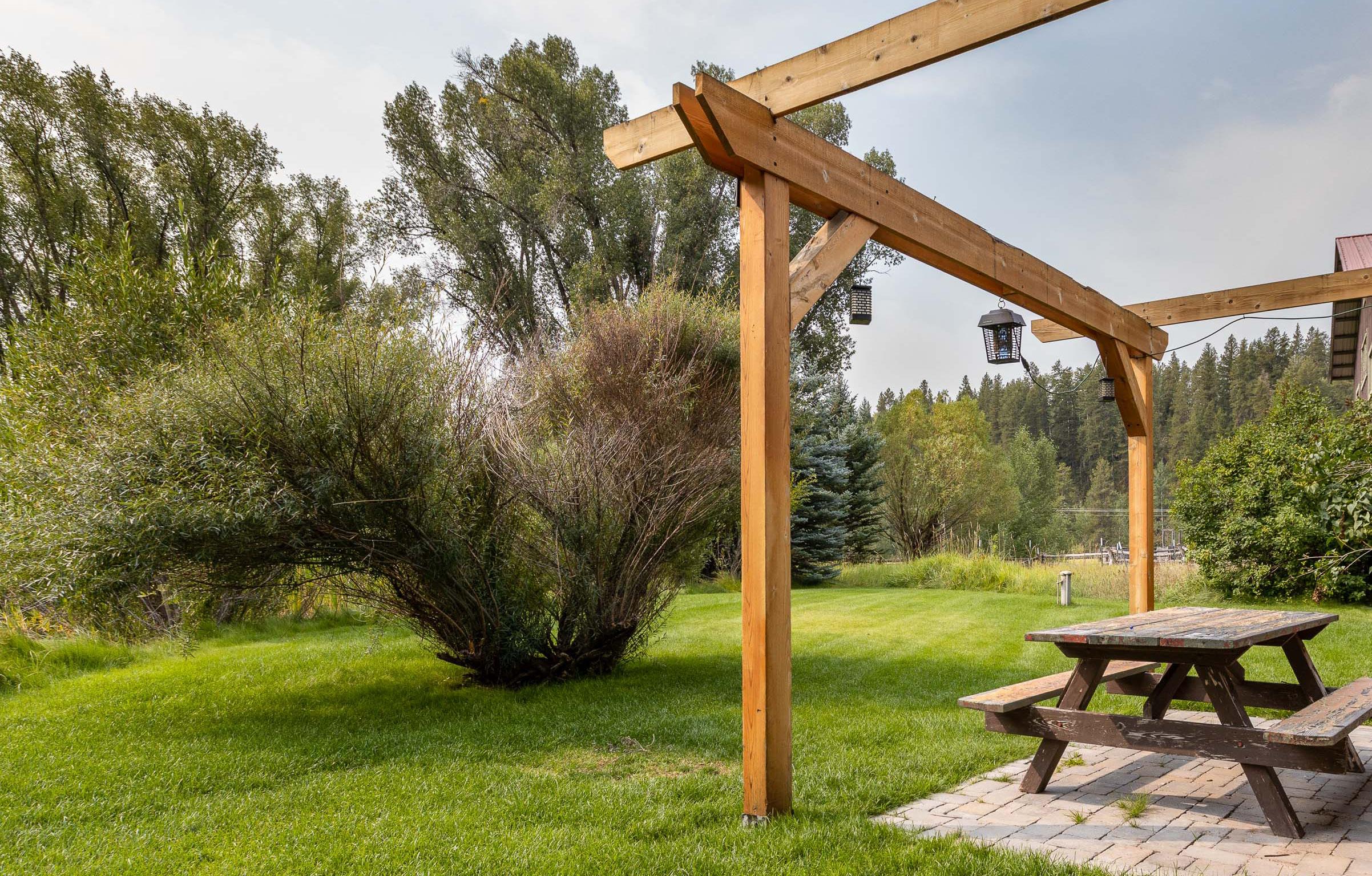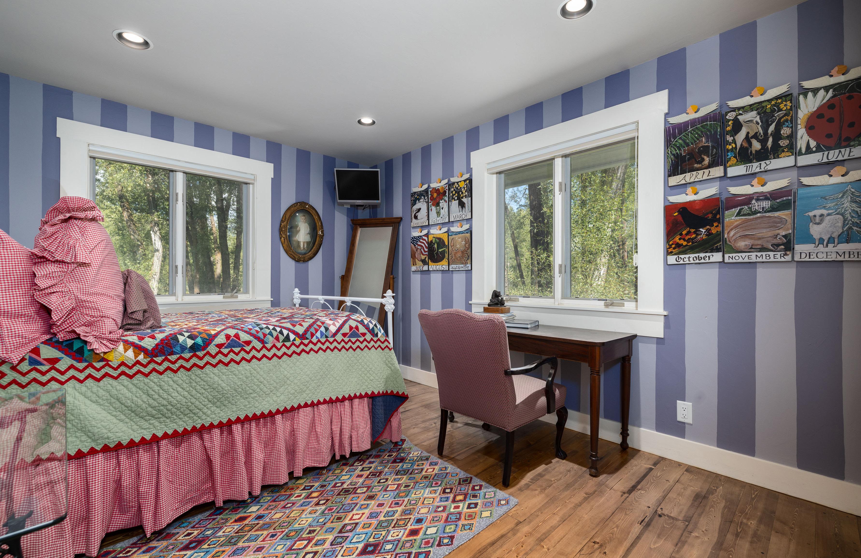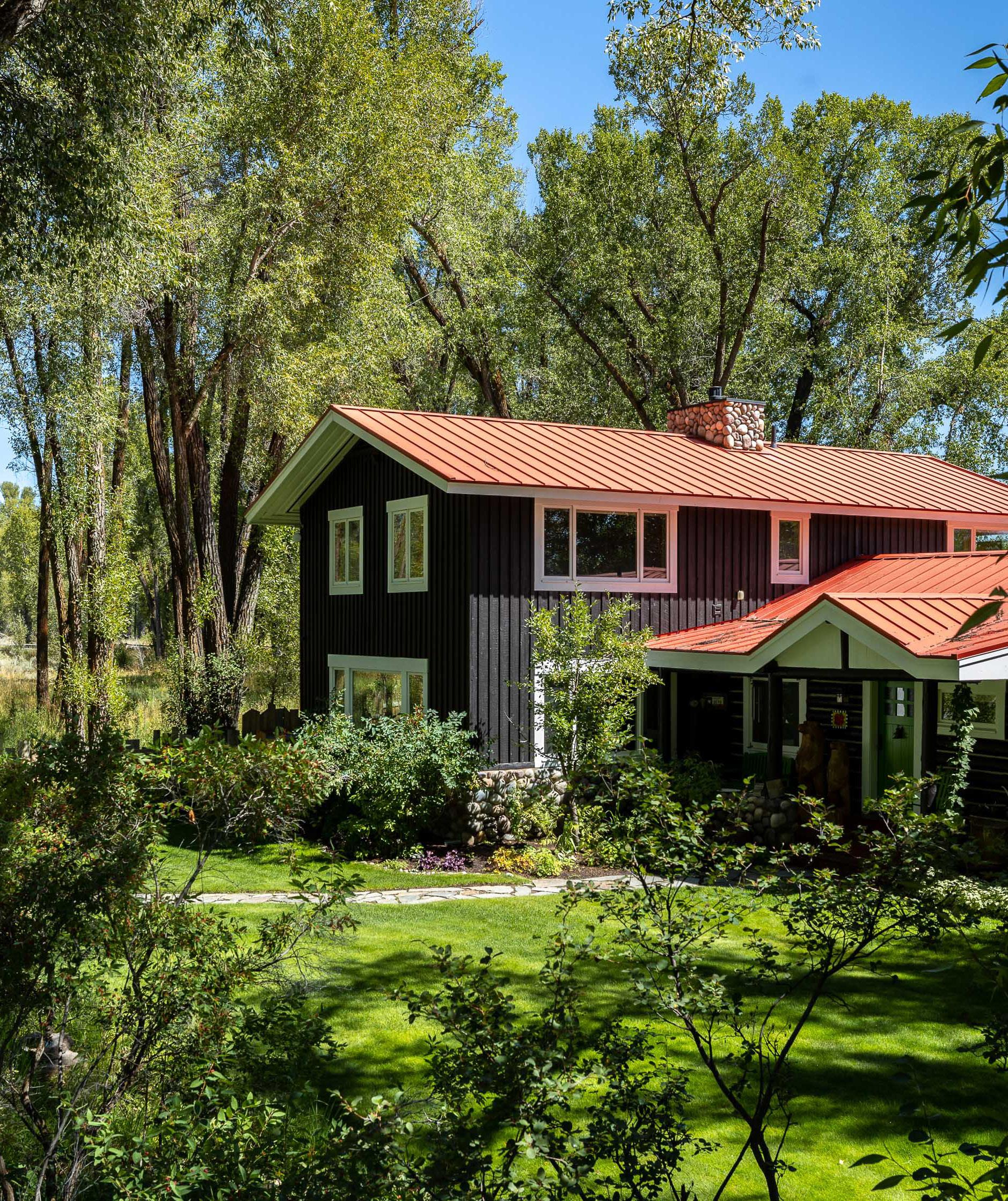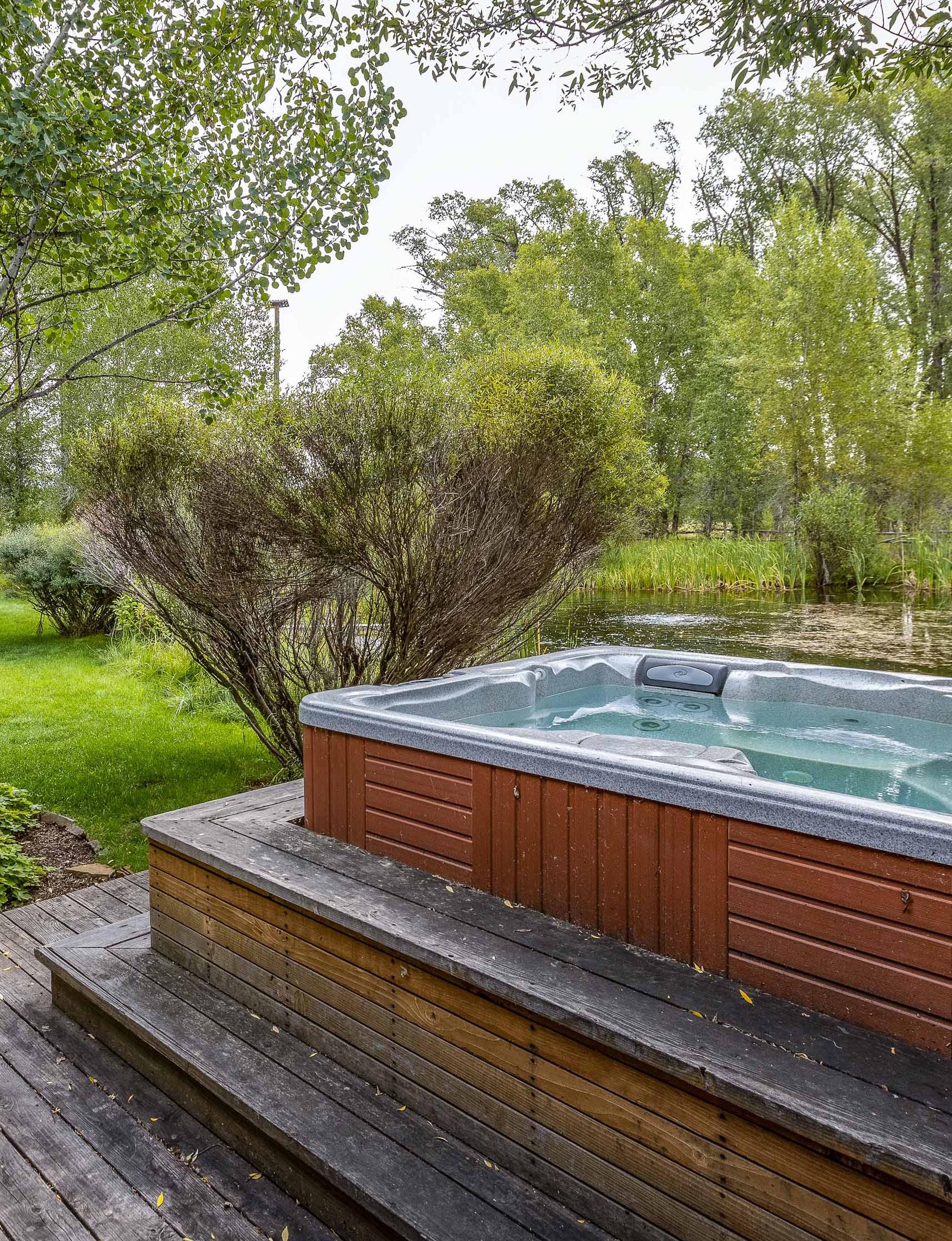 The main house, tucked on the private eastern edge of the property within earshot of the Snake River, features three bedrooms, a gourmet kitchen, sunroom and ample porch plus hot tub.
