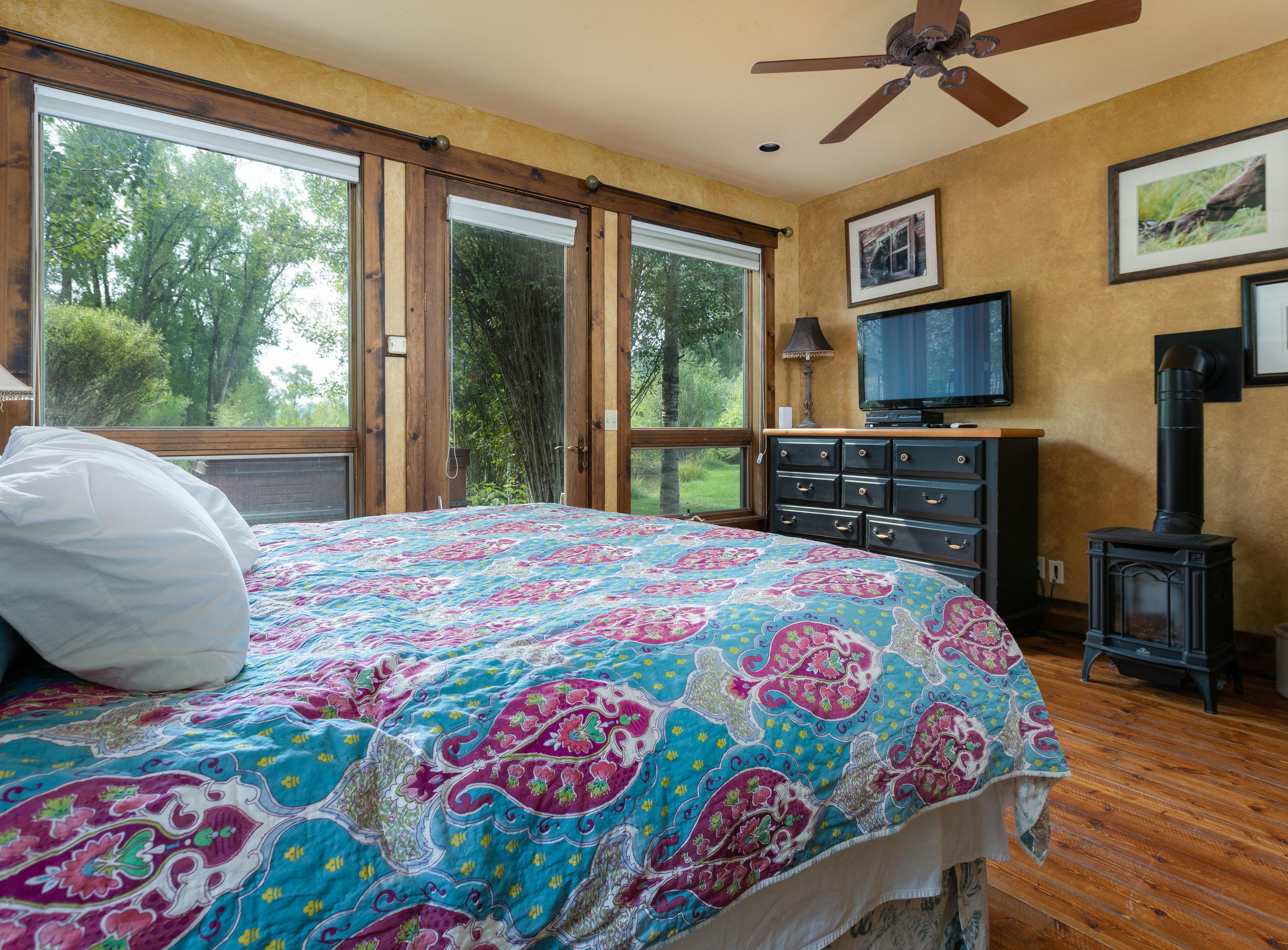 Facing south, the guest cabin represents a refuge onto itself with its two bedrooms, full bath, wood-burning stove and hot tub. Surrounded by green space, the home overlooks the pond and is connected to the oversized three-car garage.