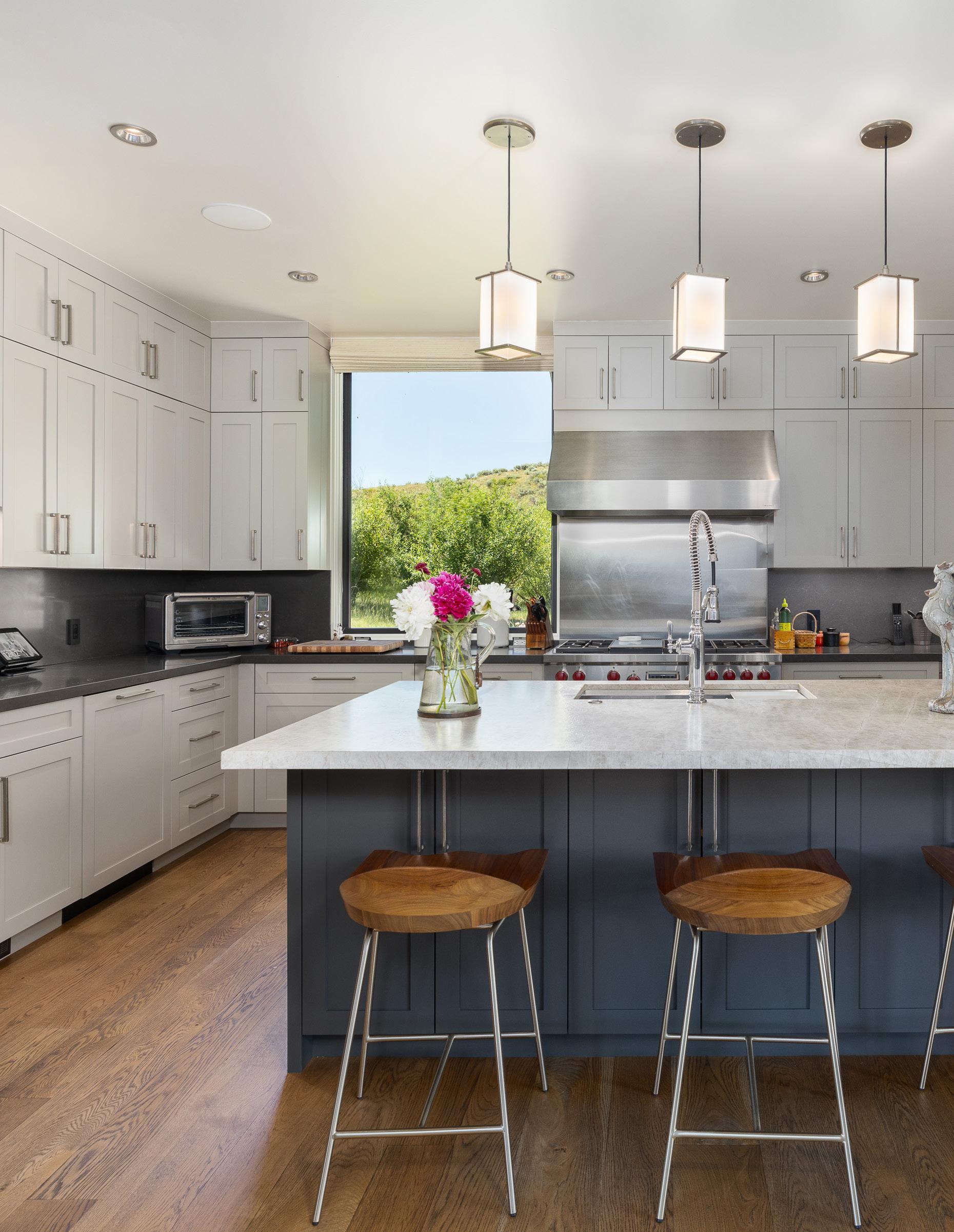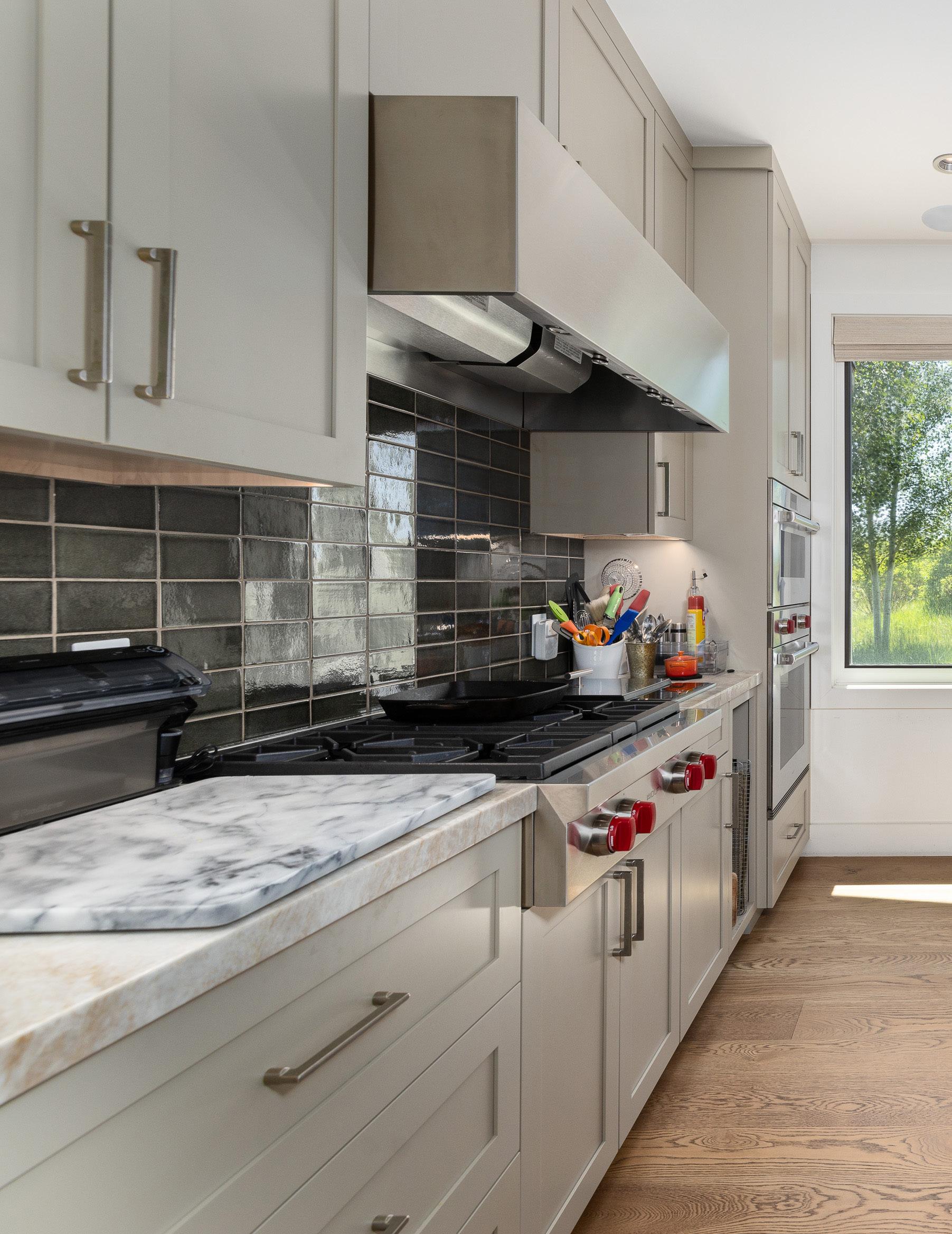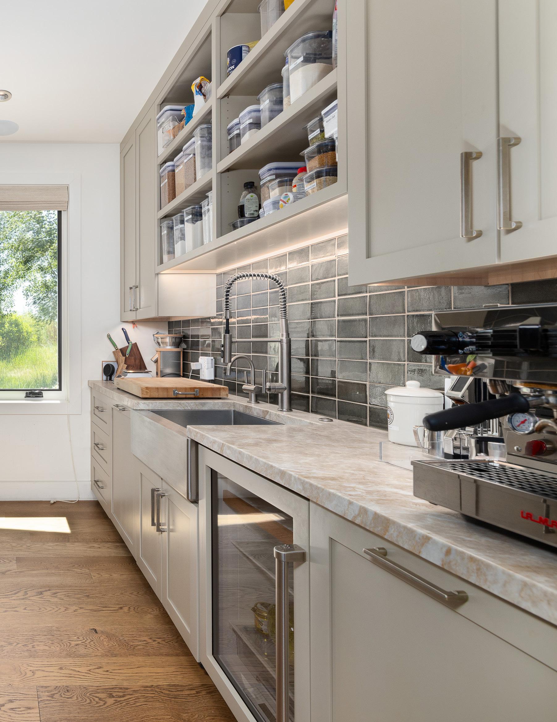 The heart of the main house is a stunning chef’s kitchen featuring top-of-the-line appliances. Adjacent to the kitchen, a fully outfitted butler’s pantry enhances prep and entertaining capacity with its own gas range, steam and convection ovens, built-in La Marzocco espresso machine, and a third dishwasher.