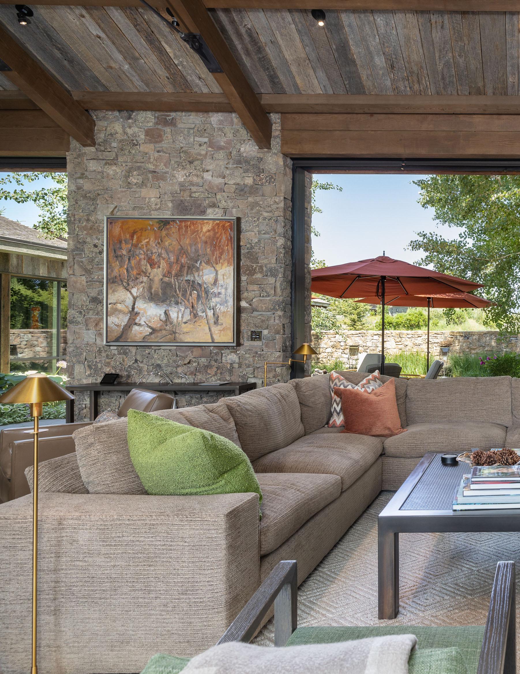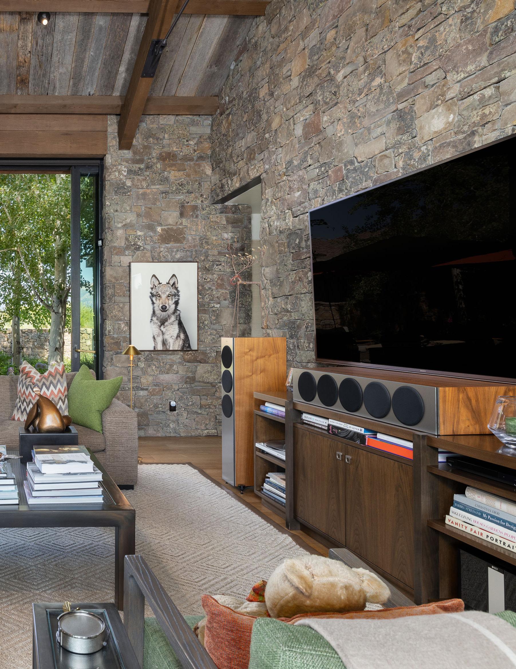 The great room welcomes you with sleek and expansive floor-to-ceiling lift-and-slide glass doors, integrated surround sound, and Crestron-controlled shades.