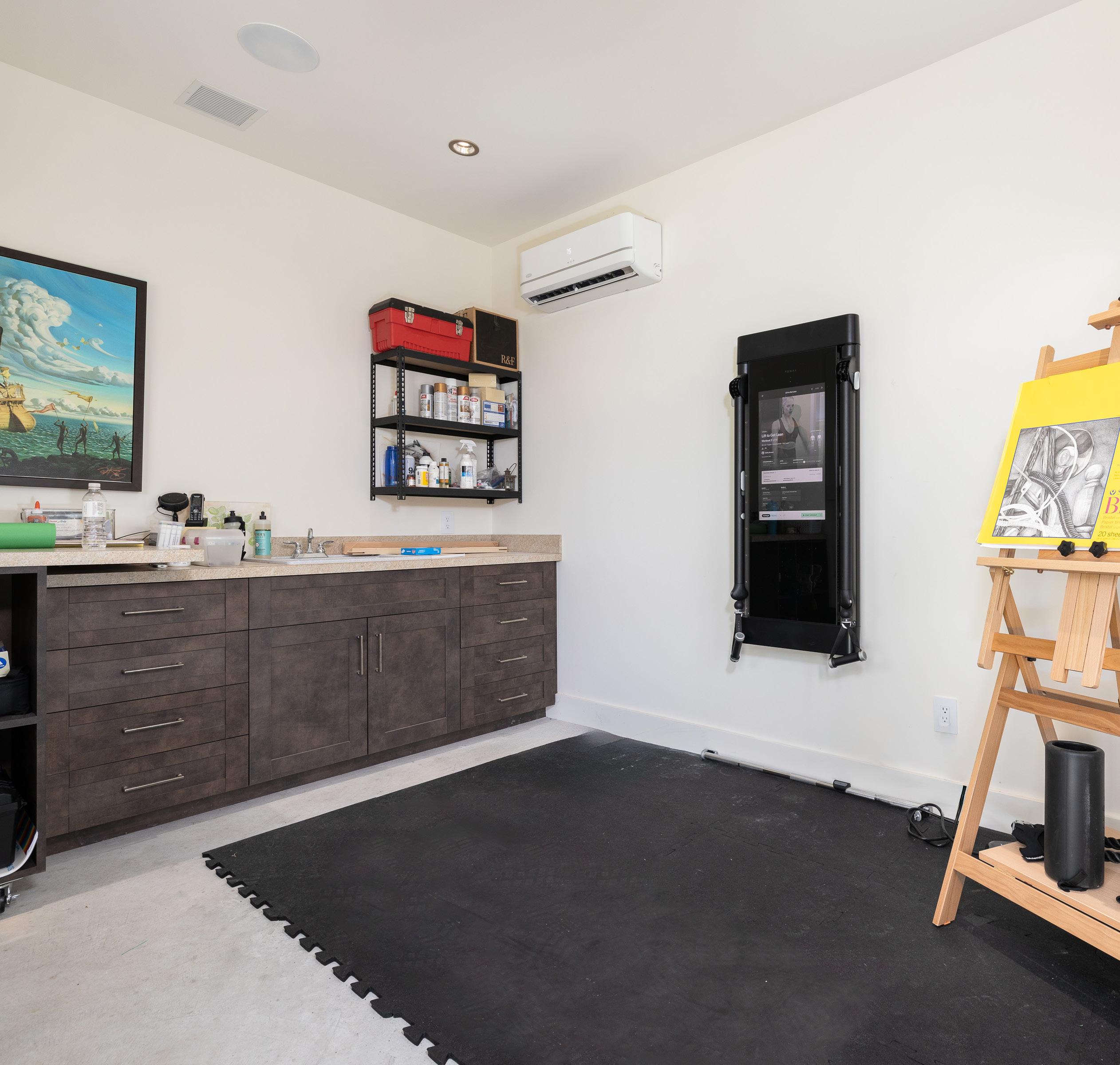 The property includes a versatile art studio featuring heated floors and a separate in-wall AC unit for year-round comfort. A modular, moveable desk and removable padded flooring provide flexibility for various creative or functional uses. Complete with a sink and a private entrance, the space can easily be converted into a gym or adapted for other purposes.