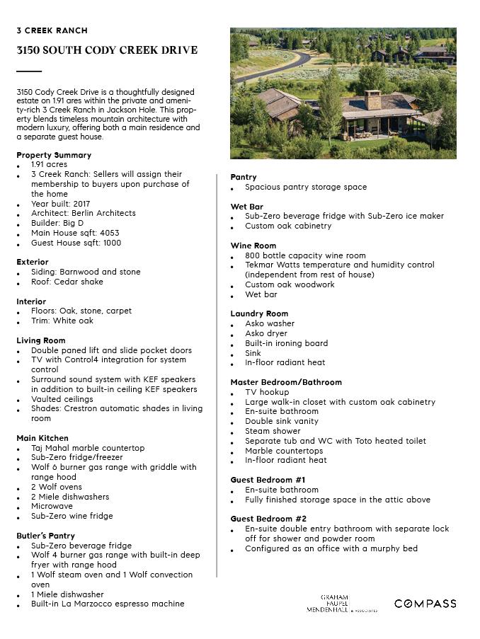 Welcome to 3150 Cody Creek Drive, a thoughtfully designed estate on 1.91 acres within the private and amenity-rich 3 Creek Ranch in Jackson Hole. This property blends timeless mountain architecture with modern luxury, offering both a main residence and a separate guest house. Designed by Berlin Architects and built by Big D Construction in 2017 and refined in 2020, the property combines rustic elegance with high-performance systems, stunning indoor/outdoor living spaces, and access to world-class golf, fly fishing, and the natural beauty of the Tetons.