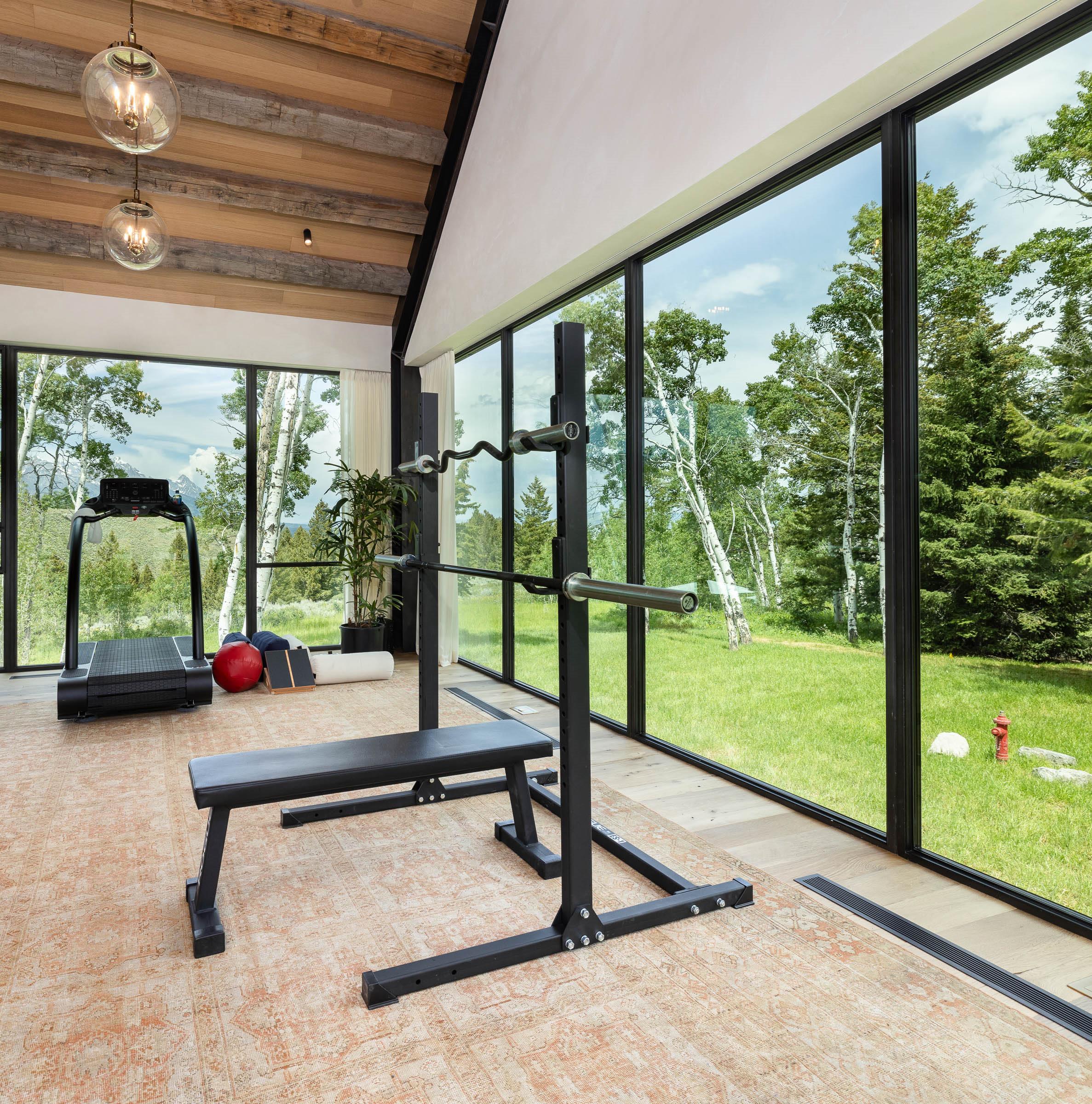 The guest wing offers a sense of autonomy within the larger home, quietly tucked away and with the option to be fully enclosed for privacy. Currently configured with two bedroom suites and a gym, the layout can easily accommodate a fourth bedroom depending on your needs. Floor-to-ceiling windows bring in soft light filtered through the aspens, while warm, natural materials create a sense of calm and continuity. Whether designed for visitors, extended family, or flexible use, this wing allows guests to feel both welcomed and independent.