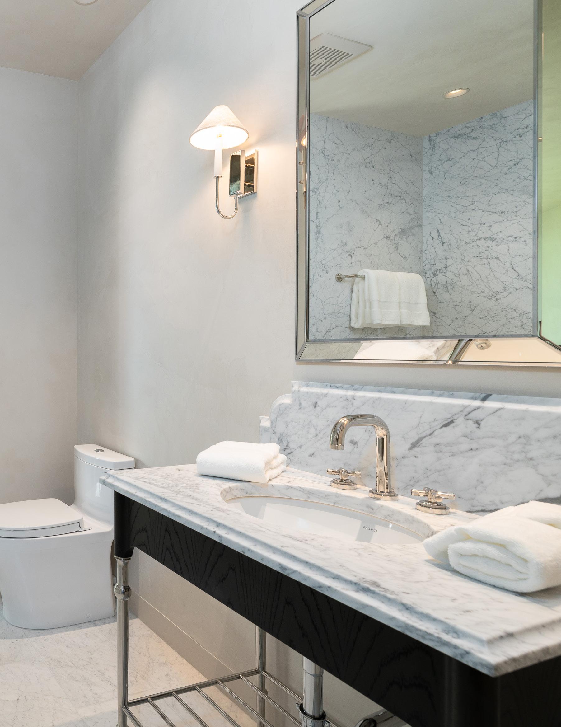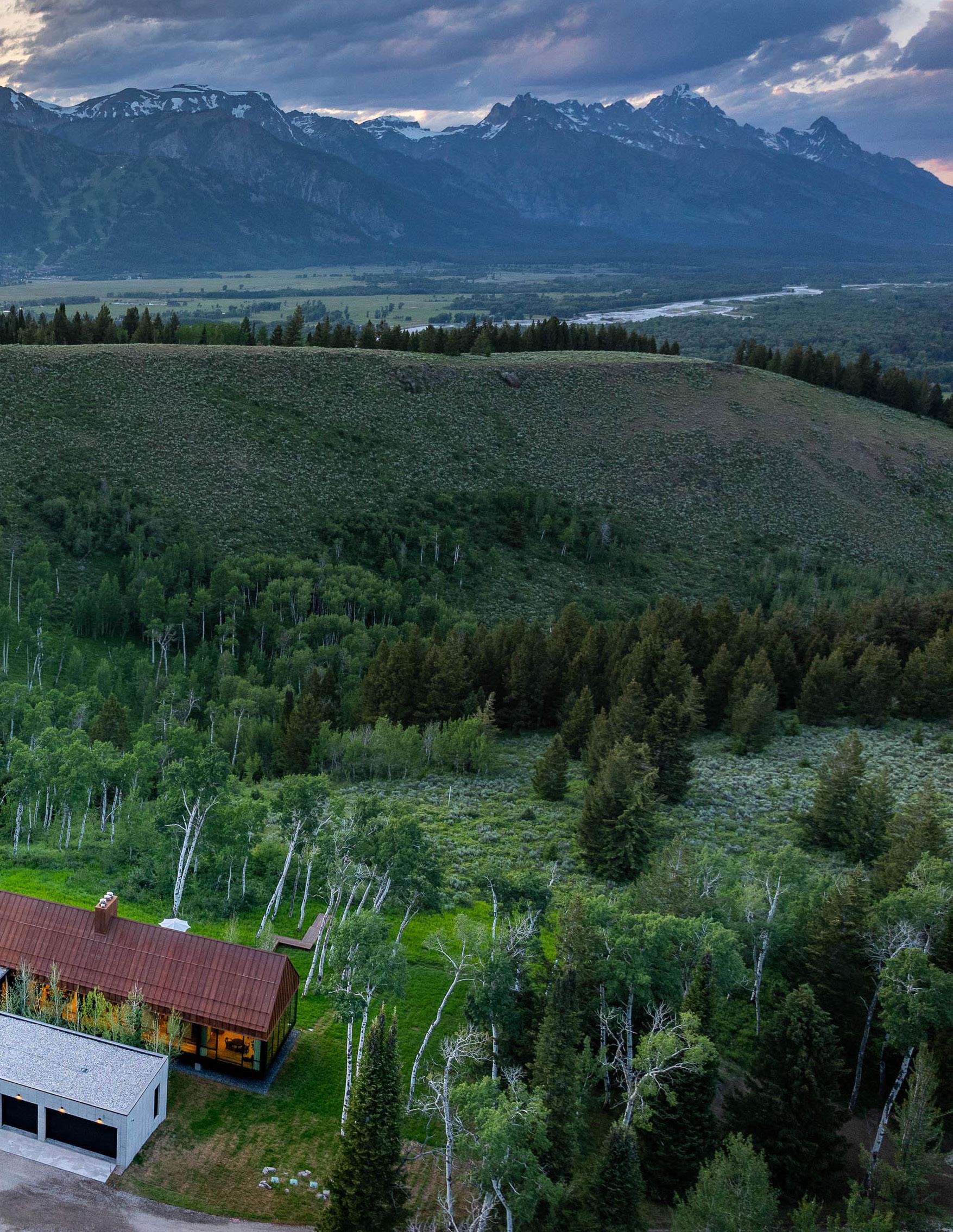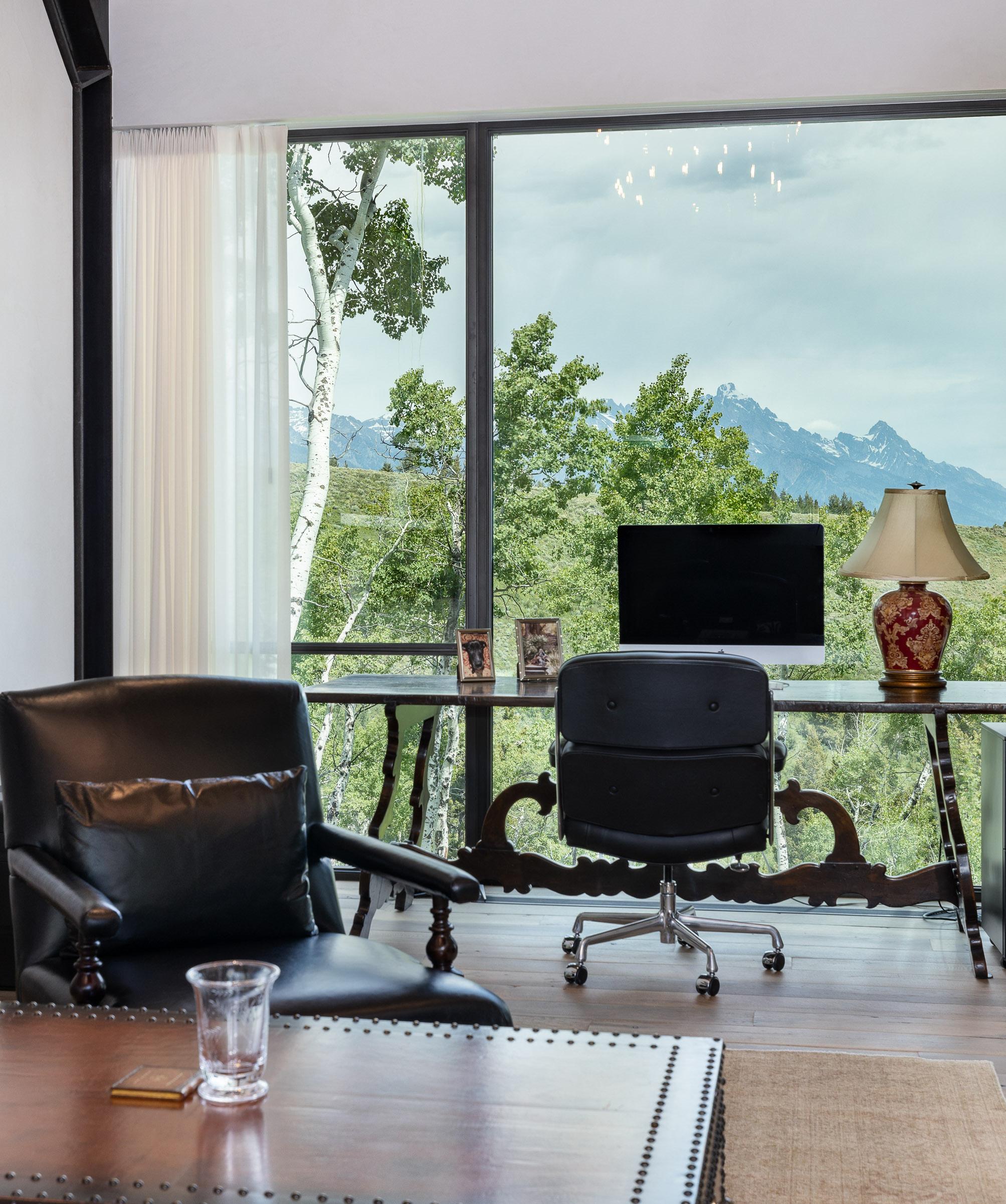 Framed by glass on three sides, the primary suite invites the outdoors in with sweeping Teton views from the comfort of the bed. A wood-burning fireplace with a silver-leafed mantle brings warmth and sculptural character to the space. The adjoining bath, clad in white & grey marble, includes a soaking tub positioned beneath a wall of windows, perfect for unwinding while watching wildlife wander by. The spacious walk-in closet completes the suite’s sense of ease and intention.