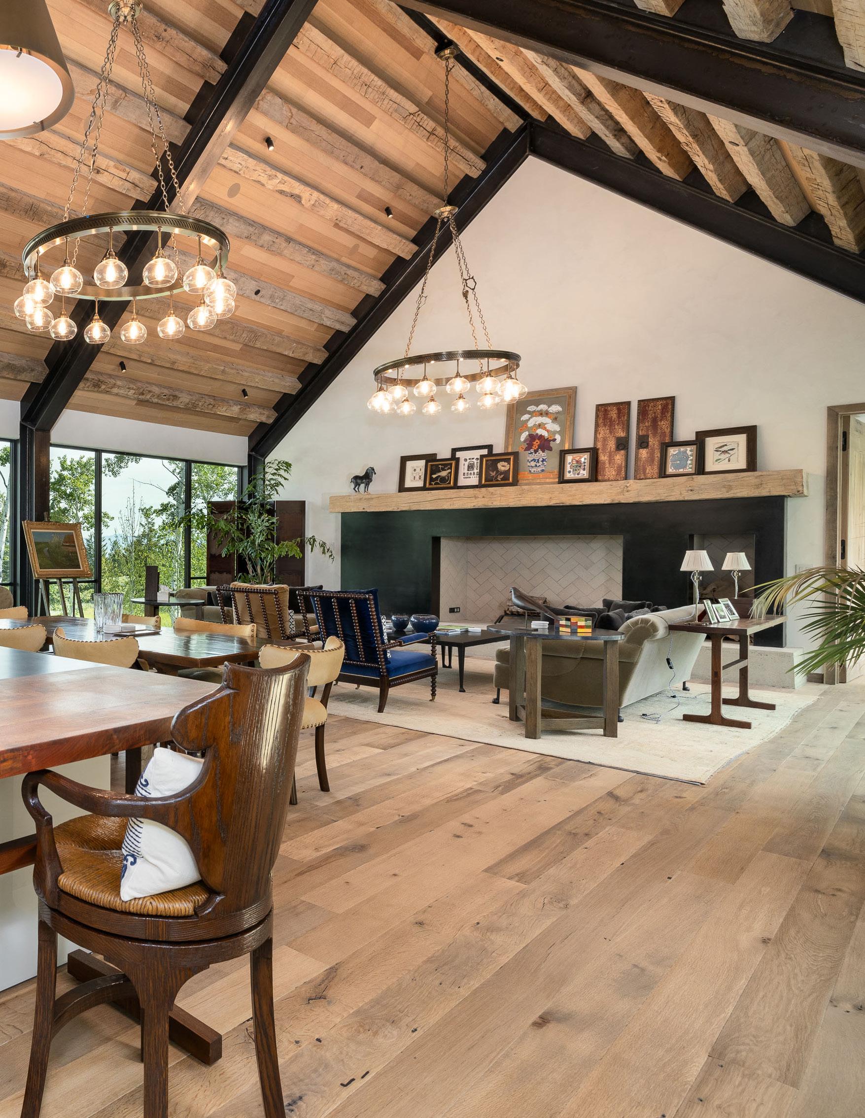 The great room is a masterclass in scale, proportion, and natural materiality. Reclaimed timbers, sourced from historic barns in Pennsylvania and Ohio, line the vaulted ceilings, drawing the eye upward while the wraparound glass walls frame uninterrupted views of the Tetons. Anchored by an expansive wood-burning fireplace, the room flows seamlessly into the kitchen and dining areas, creating an atmosphere that is as refined as it is welcoming.