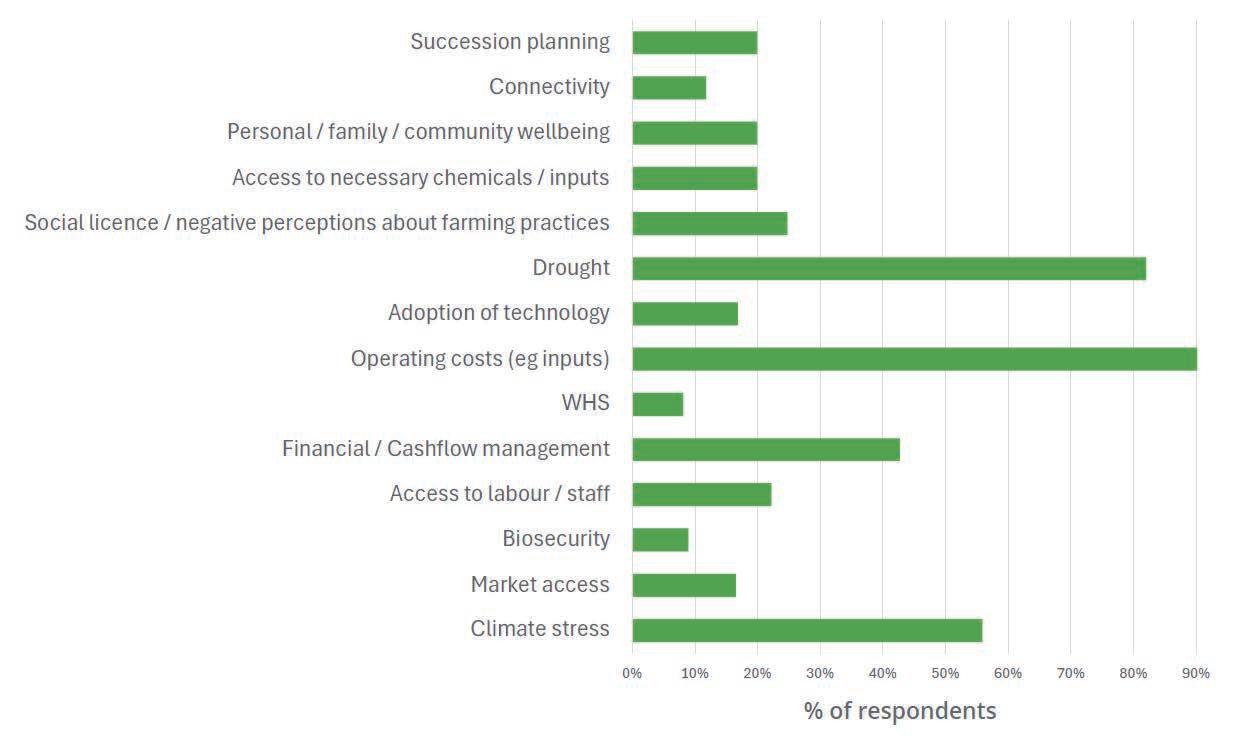 • Drought dominated responses, with 80% of growers listing it as their top challenge, while 57% reported frost damage, some describing the events as among the worst on record.