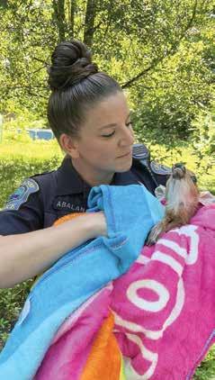 On the morning of June 1, the Granby Police Department received a report of a deer giving birth on Running Pine Road. Officer Nichole Abalan rushed to the scene and located a newborn deer that was left by its mother. Abalan saw the fawn had labored breathing and was cold to the touch, so wrapped the fawn with blankets and stimulated it to breathe.