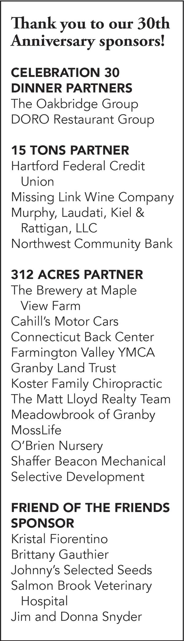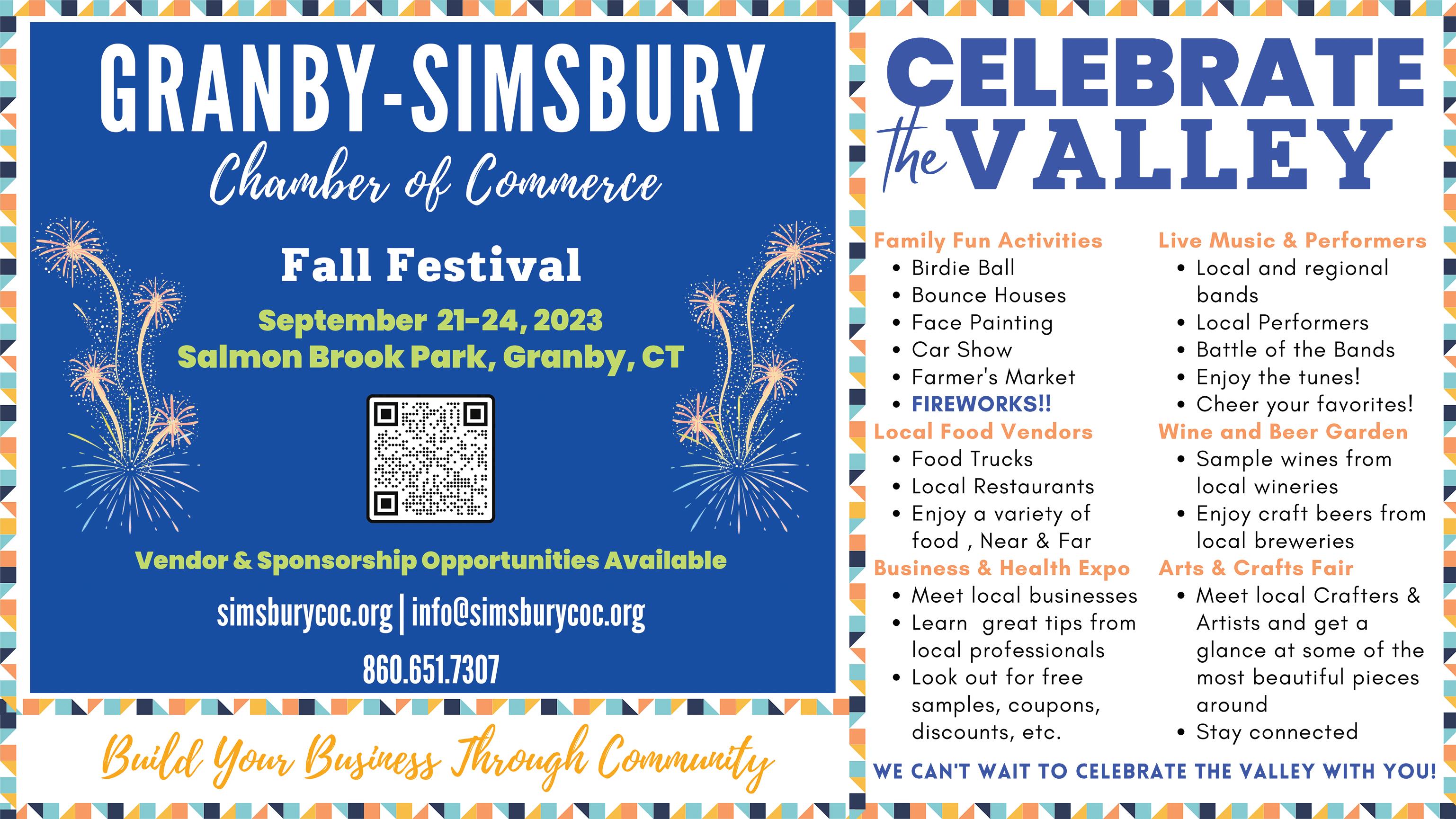 In addition to the usual maintenance of the roads, grounds and buildings that summer and fall bring, the DPW is also managing four major bridge projects in town. Moosehorn Road Bridge was replaced, and the temporary structure was removed. Preliminary work has started on Donahue Road Bridge and preliminary assessment and planning for the replacement of Simsbury Road and Doherty Road Bridges is also underway. Parks and Recreation wrapped up another fun summer of day camp and shifted to fall soccer, after school programs and a new adult wiffleball program. The Granby/Simsbury Chamber of Commerce’s Celebrate the Valley will be held at Salmon Brook Park Sept. 21 to 24.