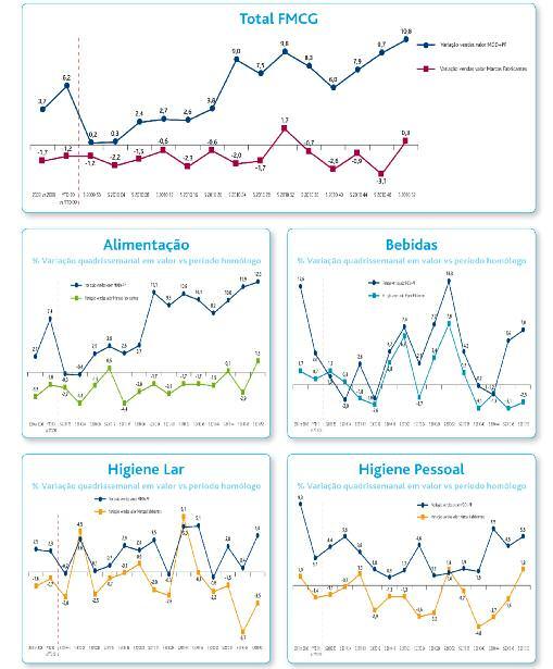 Mas, de acordo com os dados Scantrends da AC Nielsen também nos mercados de base não-alimentar, com a categoria Higiene do Lar a manter o mesmo nível de vendas em 2010, onde prevalece a dinâmica positiva das MDD+PP (+2,3%), com as Marcas de Fabricante a não conseguirem, também aqui, inverter esta tendência Realce para o facto de, nas últimas duas quadrisemanas de 2010, os decréscimos das vendas de Marcas de Fabricante terem sido particularmente acentuados, ao perderem -6,7% (Quadrisemana 45 – 48) e -3,5% (Quadrisemana 49 - 52), respectivamente