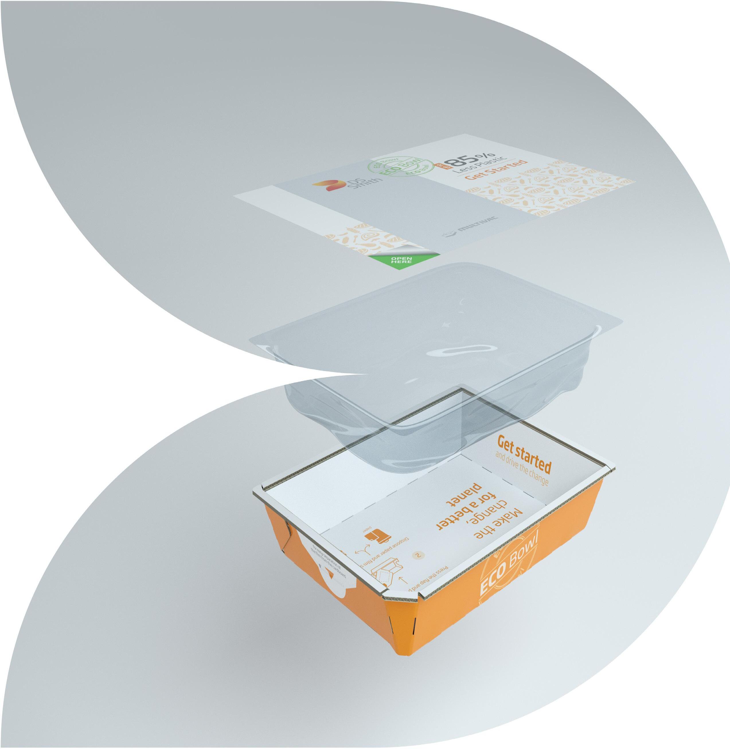 ECO Bowl é uma bandeja de cartão canelado coberta por uma na película de plástico e com uma tampa no mesmo material. Graças à sua estrutura leve e rígida, a quantidade de plástico pode ser reduzida ao mínimo e os materiais podem ser facilmente separados para reciclagem.