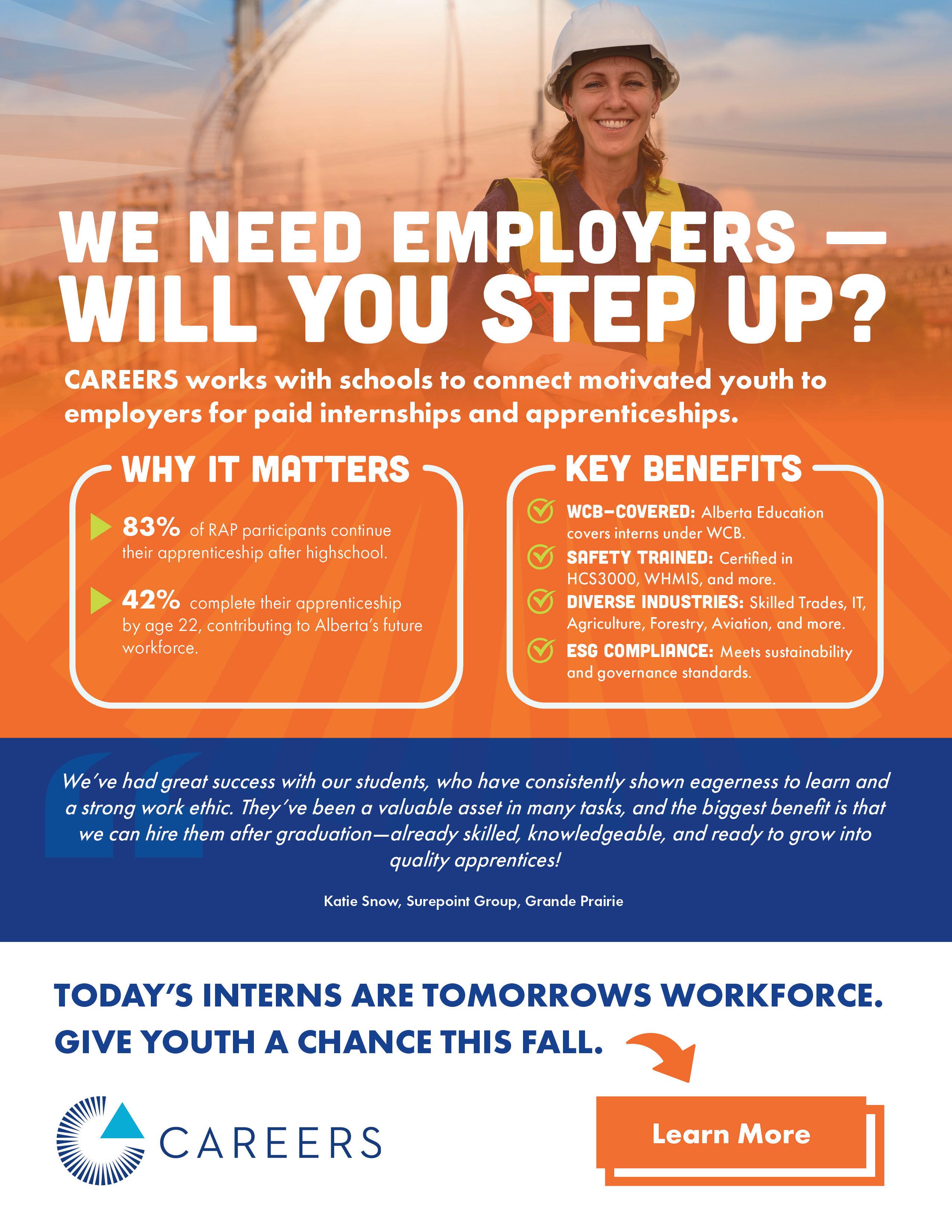 Starting October 2025, employers can access the Alberta Youth Employment Incentive, receiving $4,000–$7,500 in funding to help hire young workers. Managed by CAREERS, the program offsets $10/hour in wages and supports employers in creating youth employment opportunities.