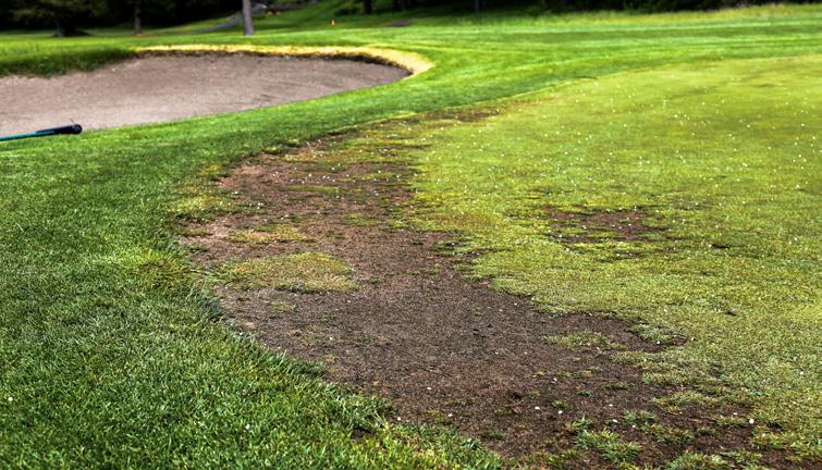 irrigation system, the quality and coverage of those systems varies a lot. It doesn’t take many hot and dry days to highlight weaknesses in the system. If dry weather persists, brown spots will get bigger and the grass will eventually thin out and die – especially in areas with heavy traffic. On the flip side, too much moisture in the soil can suffocate grass or promote damaging diseases. Excessive moisture also makes grass more vulnerable to damage from traffic and extreme heat or cold. Regrading areas or installing drainage can improve problem spots, but not all courses have resources available for these projects.