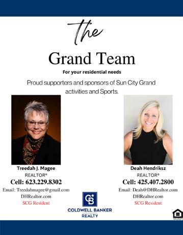 The Association provides this publication for informational purposes only. SCG Community Association, its Board, its employees and all other entities within SCG do not guarantee, endorse, nor promote any of the products, services or individuals advertised herein and assume no responsibility or liability for the veracity of the statements made in this publication. Information regarding advertising rates can be obtained on our website at www.suncitygrand.com/Communications/GrandLifestyles-magazine, scroll down to Grand Lifestyles Advertising. The deadline for commercial ads is the 10th of the month prior to placement. Sun City Grand Community Association, Inc. reserves the right to revise or refuse submitted articles and/or ads. If you have any questions about the Grand Lifestyles, please feel free to contact the Activities Office at 623-546-7452.