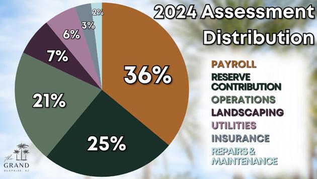 The Board was able to minimize the increase of the annual assessment resulting in an increase of just $5.50 a month or $66 a year. Below is a chart that shows where your assessment funds go. You will notice that 25% of the assessments go to fund our Reserve Fund (maintenance and replacement of current assets) and the remaining 75% towards running the day-to-day operations.