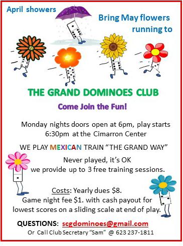 Happy Hours are scheduled for the 1st and 4th Tuesday of every month now from 6-8pm. Join us at the Palm Center every 1st Tuesday of the month and the Cimarron Center every 4th Tuesday of the month. Come out and have a Grand time, DJ Curtis will provide all your favorite tunes!