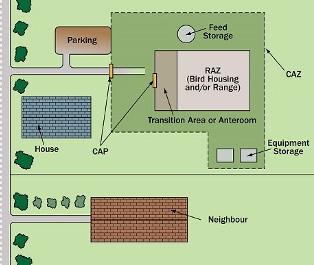 Tertiary biosecurity: involves daily management practices. Farms should establish a Controlled Access Zone (CAZ) around each barn (minimum 15 m) and a Restricted Access Zone (RAZ) inside each barn to control pathogen entry.