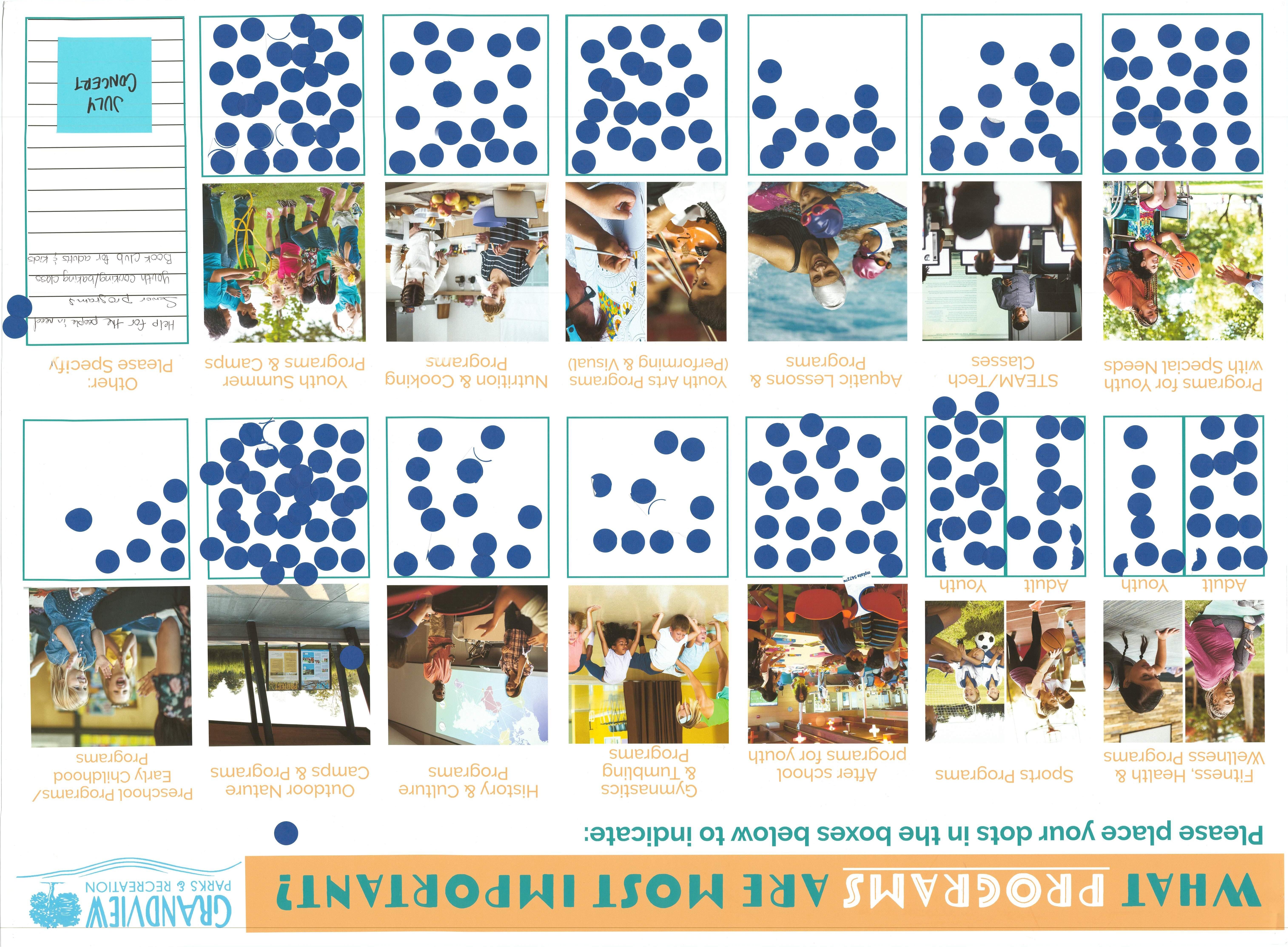 Results from the overall community engagement effort revealed a consistent and clear message about what residents would like to see prioritized in the coming years. Below are lists of the top 5 priorities, park amenities, and recreation programs that are most important to the community. Improvements in these areas are likely to have a positive impact on the greatest number of households: