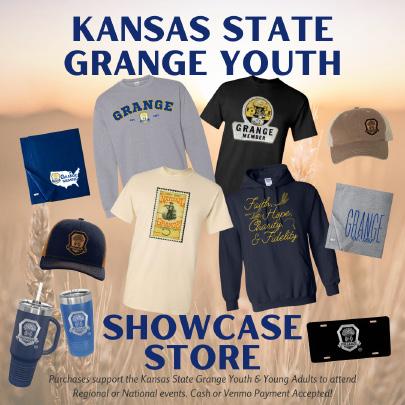 Don’t miss out! National Grange Showcase Store, supporting the Kansas State Grange Youth Department has a limited supply of t-shirts, sweatshirts, hoodies (S-5X), tumblers, hats, and license plates. Every purchase helps fund Youth & Young Adult programs and our upcoming 2026 Great Plains Regional Conference!