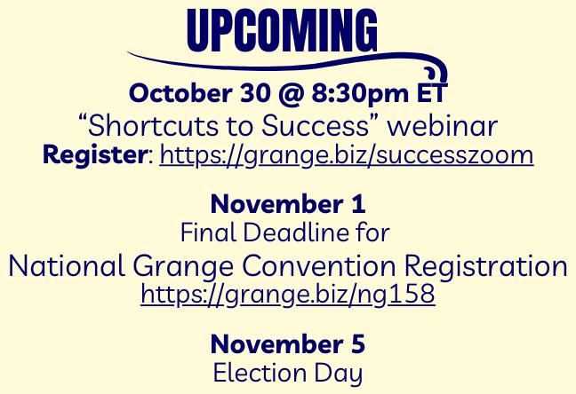 The late registration period is open through November 1st - after which time, registrations WILL still be available on site, though no additional meals will be available. Visit http://www.nationalgrange.org/158thconvention to register today!
