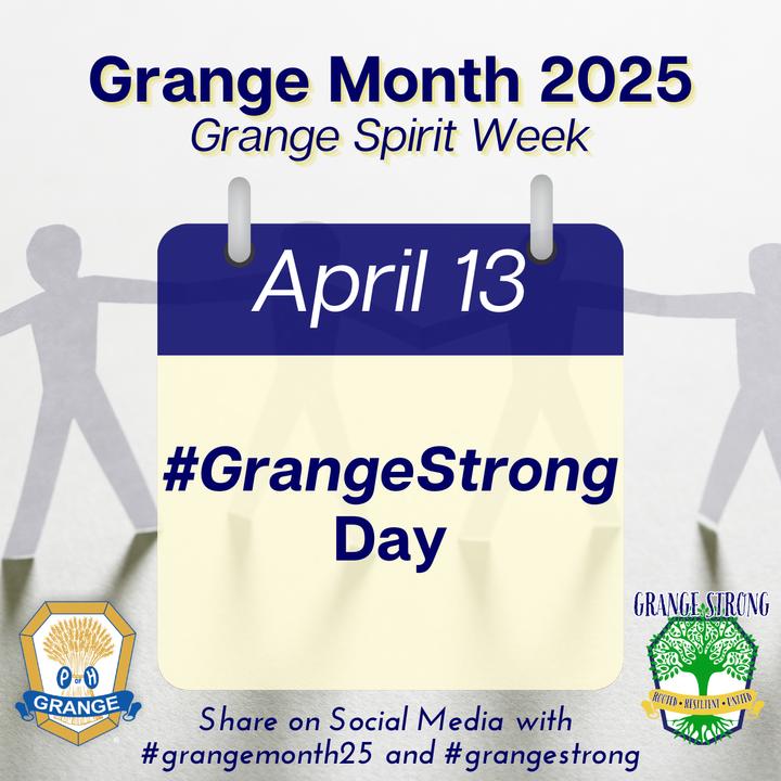 Each day during Grange Spirit Week, we invite you to share our posts, engage with the topics, and share why you are proud and excited to be a Granger! Let’s flood social media with #GrangeMonth25 and show why being #GrangeStrong is so important for our communities, as well as our individual well-being Take a look at the daily images and prompts below, so you can be prepared to share!
