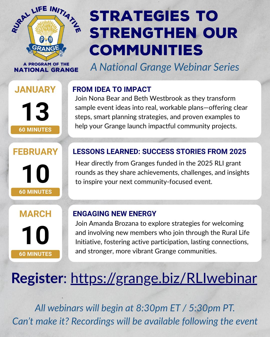 It is recommended that all those interested in future opportunities to help bridge gaps in their hometowns should tune in to the National Grange’s new Strategies to Strengthen Our Communities webinar series. These three webinars, “From Idea to Impact” on January 13, 2026, “Lessons Learned: Success Stories from 2025” on February 10, 2026, and “Engaging New Energy” on March 10, 2026, will focus on the RLI program. Register for the first webinar at https://grange.biz/RLIwebinar . Registered attendees who stay through the end of the webinar will receive a special gift following the event.