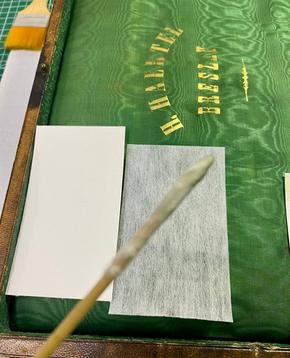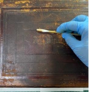 Siguiendo el procesos de intervención aplicados únicamente a la devolución de legibilidad y exposición. La pasante realizo injertos en los faltantes correspondientes del estuche y a su vez, termino el proceso aplicando la técnica conocida como “reintegro cromático” para igualar color y tono, así devolviéndole homogeneidad al estuche.