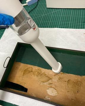 En las siguientes imágenes se ve el registro realizado por la pasante Carolina Palma, en donde observamos procedimientos, tales como: limpieza mecánica, limpieza con solventes acordes al material en el Maletín como también en la bandeja removible por anverso y reverso.