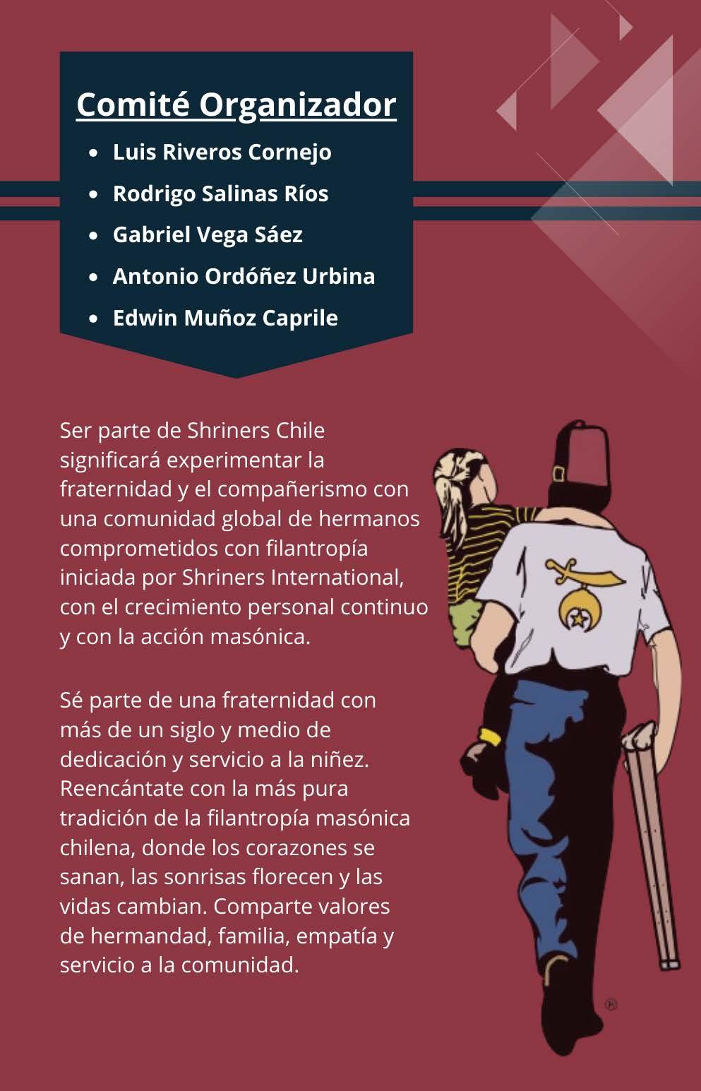 SHRINERSEstás invitado a participar en la fundación del capítulo chileno de esta obra filantrópica, digna de la acción masónica que fomenta e incentiva la Gran Logia de Chile.Solicita tu formulario de inscripción: +56 9 9432 6965