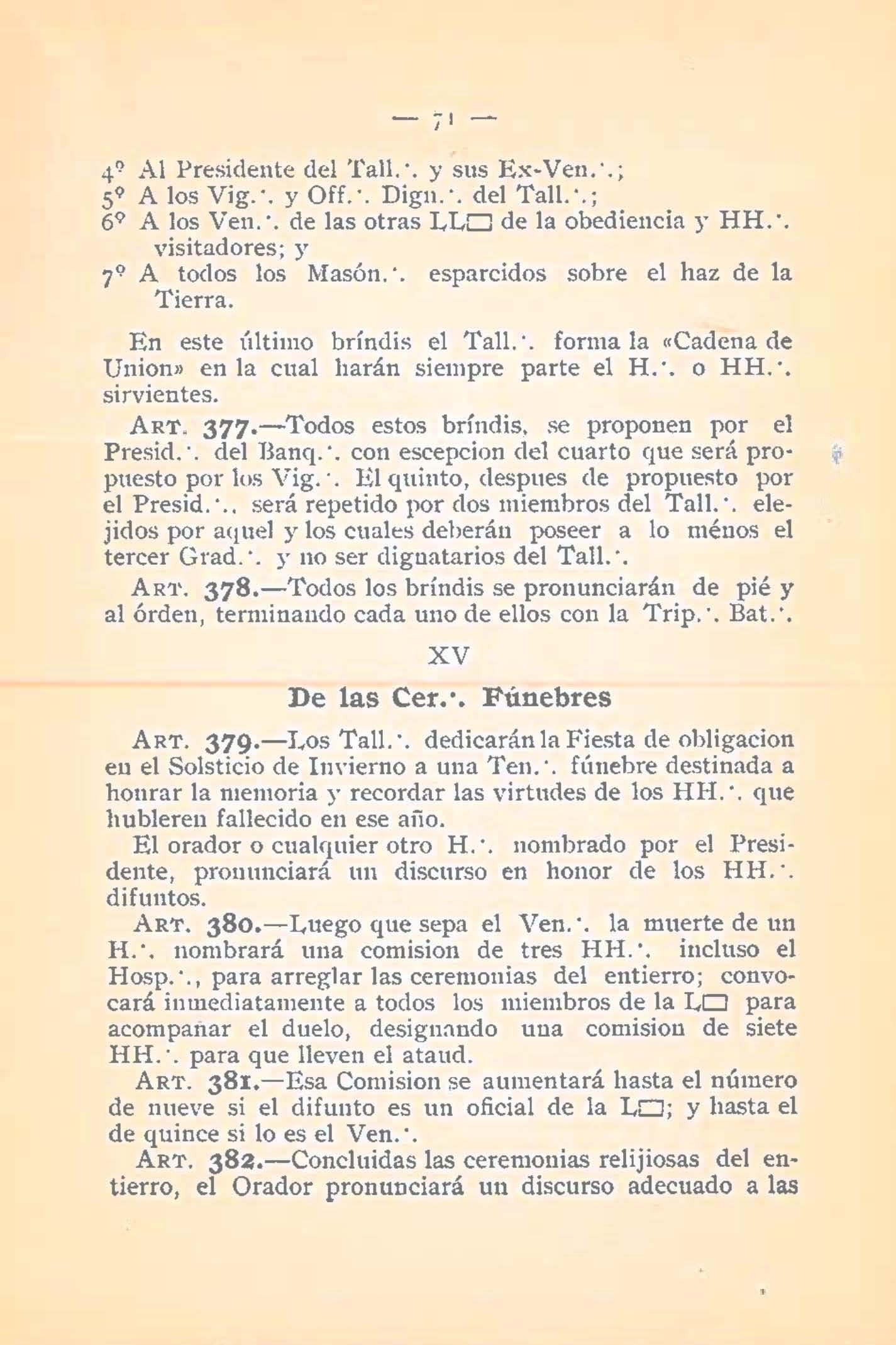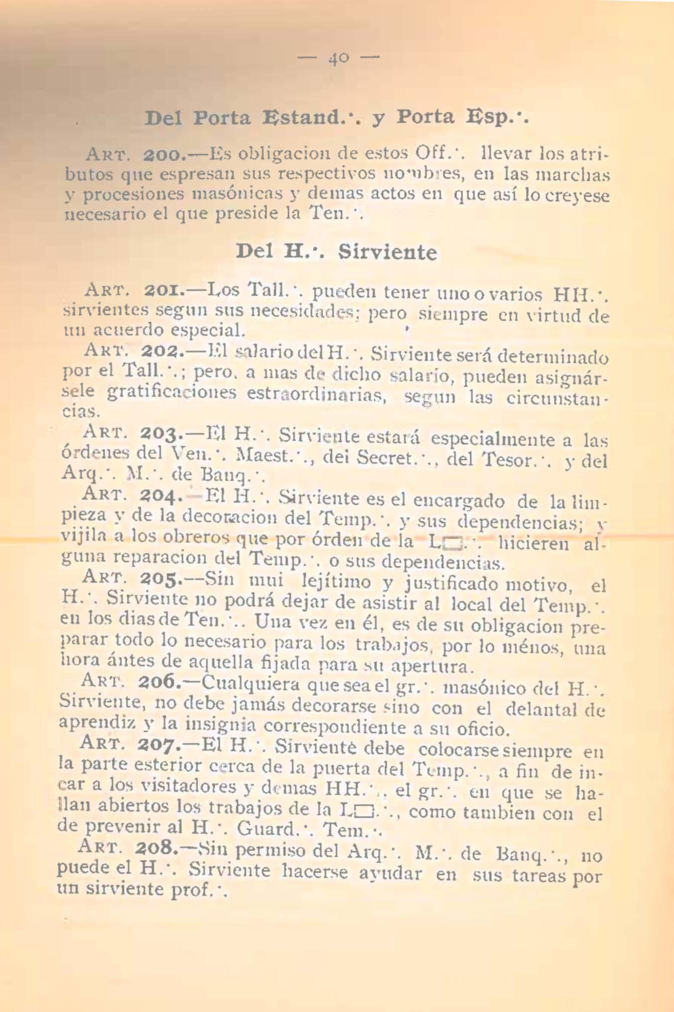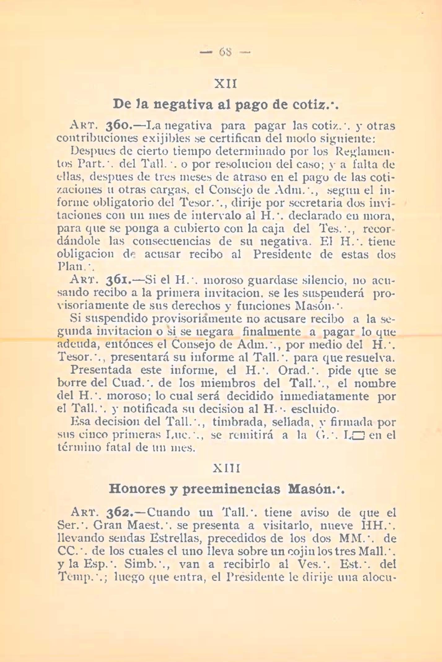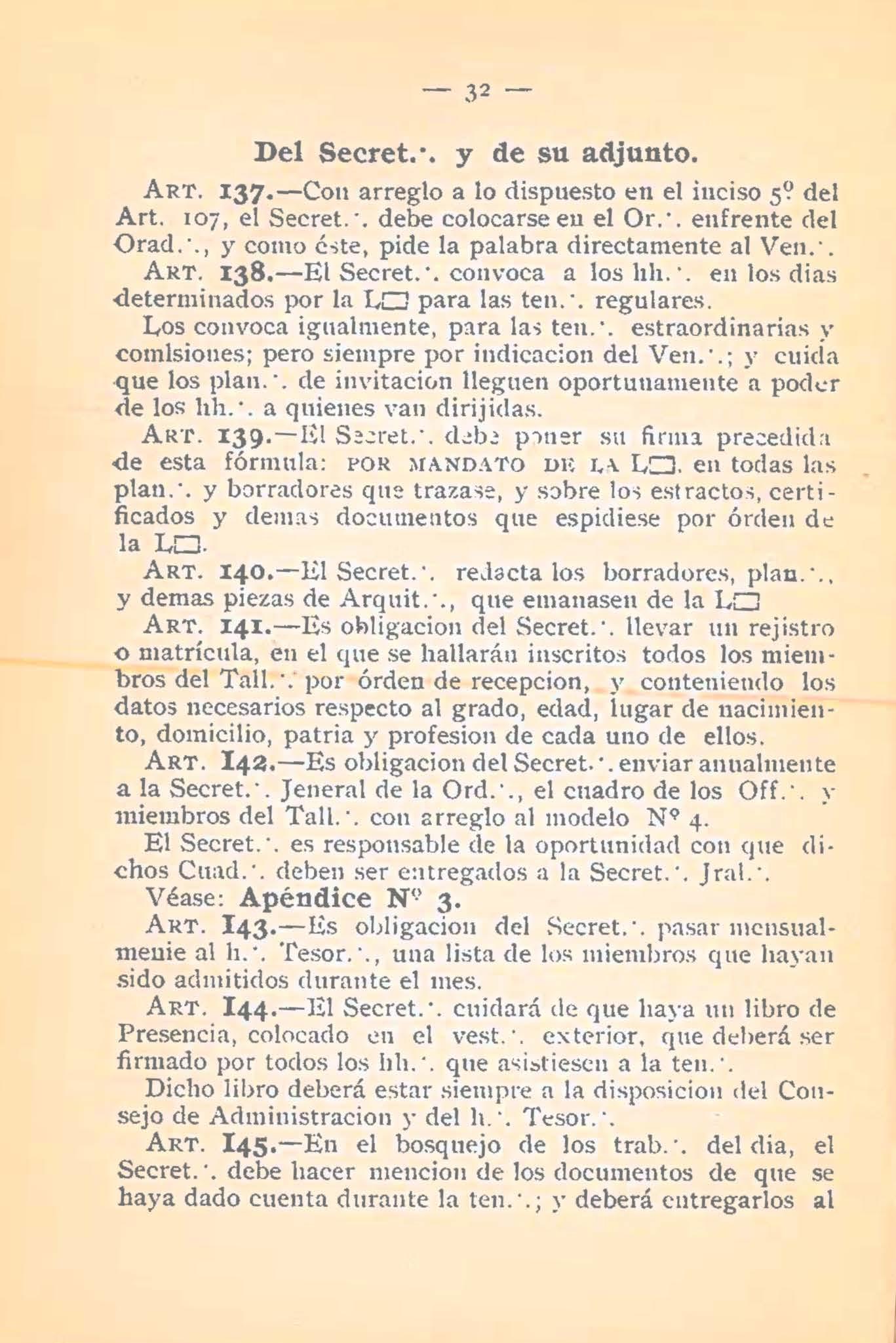 El Estatuto fue publicado en el año 1907 bajo el mandato del Gran Maestro Víctor Guillermo Ewing, quién se ocupó de importantes reformas a la Constitución Masónica y a los Rituales. El documento consta de 111 páginas con 465 artículos; 10 modelos de documentos oficiales y 7 apéndices.