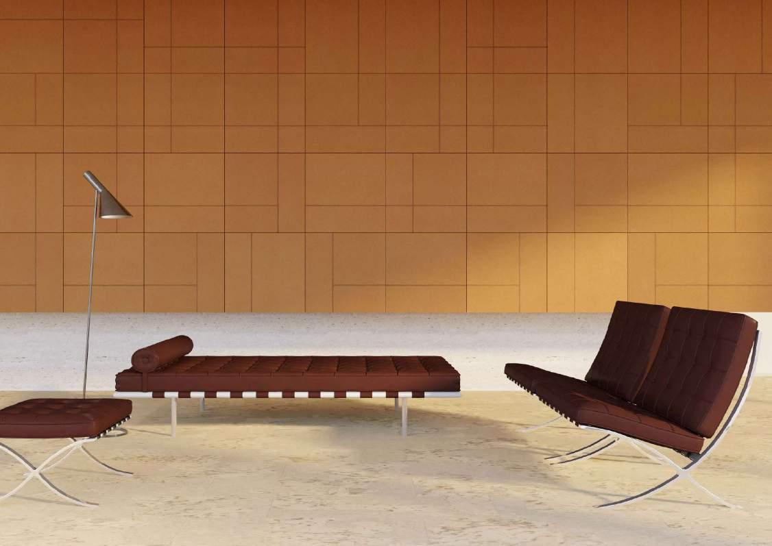 Modular Modular Pearl 314 048 011 Modular Terracotta 314 048 616 Modular Bluemoon 314 048 621 Modular Smoke 314 048 042 Modular Dark 314 310 000 Design by Carlos Mendonça Modular 314 3D Cork Wall Tiles Renewable materials: Cork Recycled by-products of Cork FSC® certified products are available upon request. CORKGUARD® waterbased protection with CleanSurface technology CNC machined agglomerated cork 580 x 580 x 7 mm Glue-on