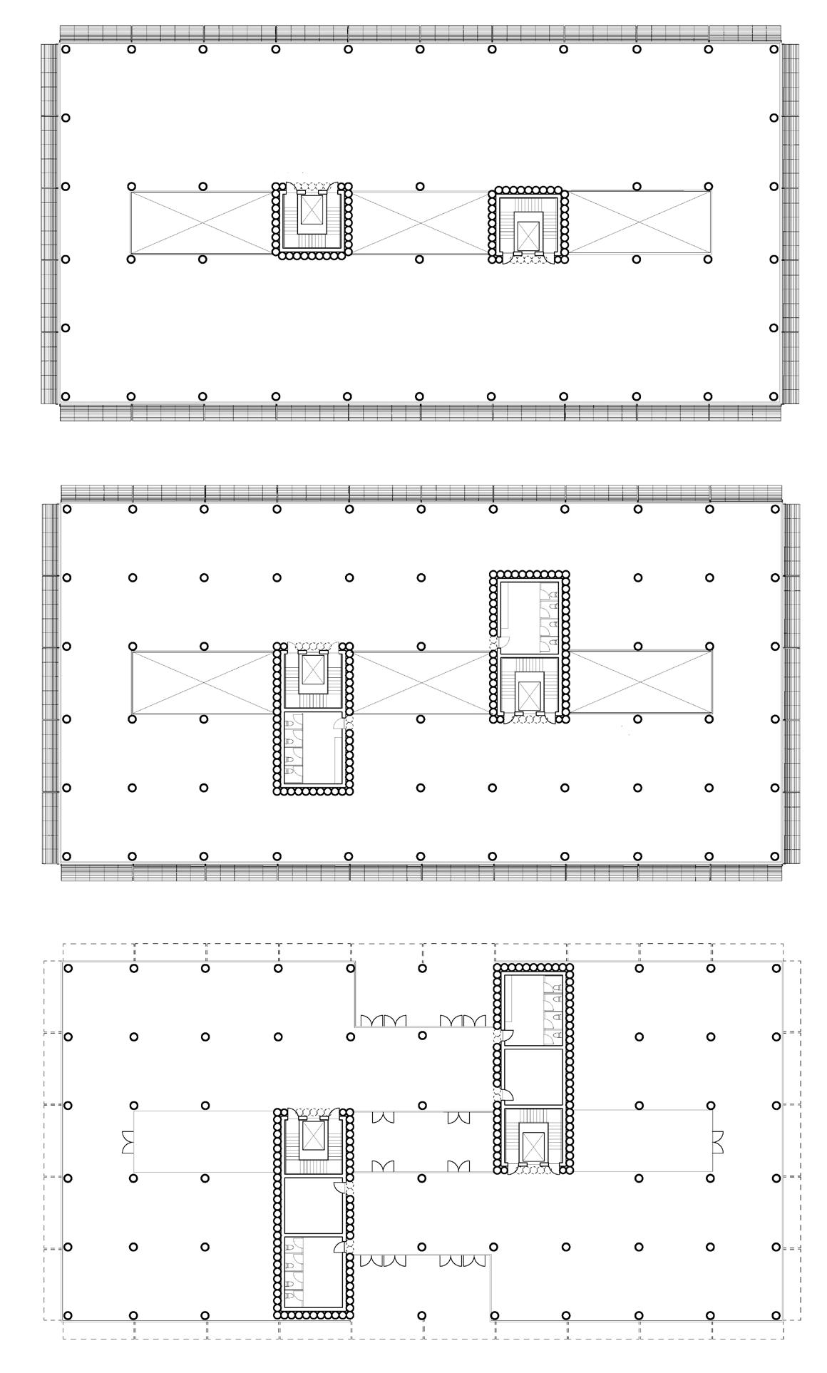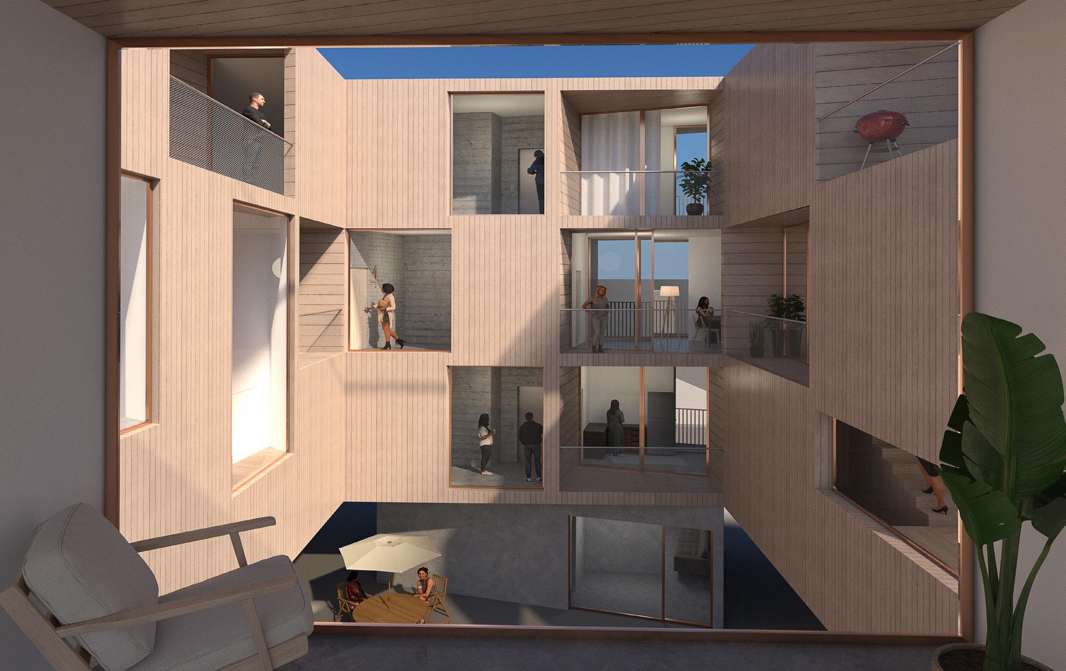 The Oakland LGBTQ Center introduces a structural design featuring rotated cores that house recreational spaces such as an art gallery, theater, and a garden café. Upper floors offer housing units for temporary and long-term residents. Angled cores create distinctive common areas, encouraging interactions among residents as well as fostering inclusivity within the LGBTQ community. Additionally, only the dwelling units are conditioned spaces; all other areas, including the programmed spaces, are naturally ventilated due to the design of the mesh facade and open cores.