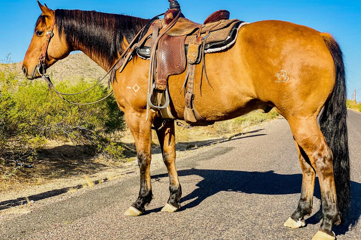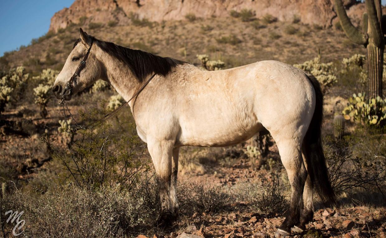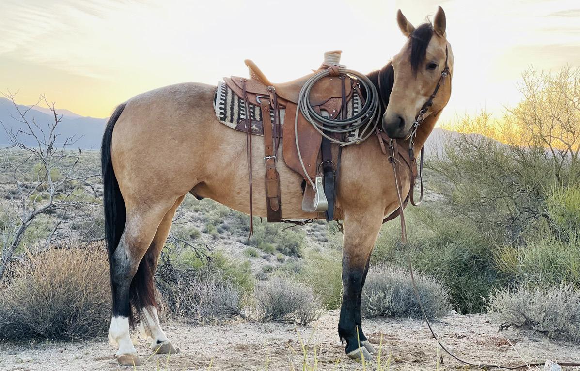 This is the kind of gelding you want a pasture full of! Affectionately known as “Straw Baby”, he absolutely shines wherever he goes. He is truly the “”elite ranch horse”” suitable for the whole family. He has seen our whole program from packing salt-to packing a bridle. Straw has been used extensively for all aspects of ranch work and is the first you want to catch to go do a job. He is a smooth mover and confident in any kind of country- from rough mountains to wetlands to desert. We have roped steers out of the box for the past 3 winters in AZ, mostly heading but will switch ends or steer stop too! There isn’t a job we’ve asked of him that he hasn’t done.