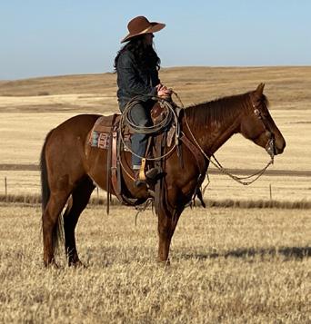 “Iris” is sweet, well minded, has a forgiving soul and tries so hard for you. She was going to be my next roman riding and trick riding horse but I decided someone else might need Iris to get them to where they want to be as a cowgirl. Iris is a great representation of who I am as a cowgirl and the horses I want to produce! We have used on the ranch by all levels of riders. Ride through mud, rivers, bush, bareback and down the trail on a loose rein! Nothing phases her and she is confident to ride alone. Iris is always ready to chase cows, go over jumps, brand calves, rope drive as a team or trail ride and is finished team roping on the heel side.