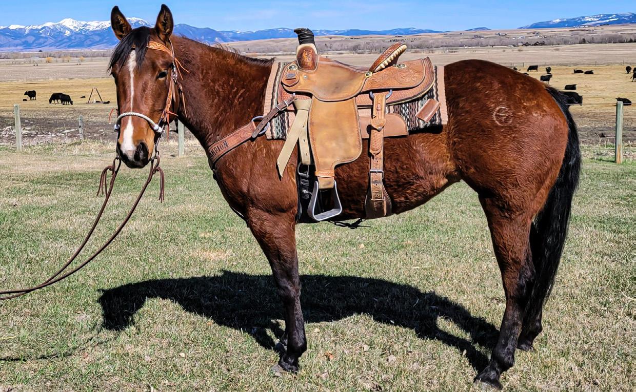 His name is “Monkey Bars” and his name fits him! He’s an absolute gentleman that you can crawl all over! Kind, gentle and as handsome as can be with a heart the size of Montana! He’s cowboy looking and will get you noticed wherever you go! He has done all aspects of ranch work and will go anywhere and do anything willingly. He’s super laid back and a pleasure to ride. Monkey Bars is great to ride outside and he’s the same horse every time you get on him regardless of time off and no matter the situation. He is patterned on the barrels and is started in the arena as a head and heel horse. If you’re looking for a true Montana gentleman than Monkey Bars is your guy.
